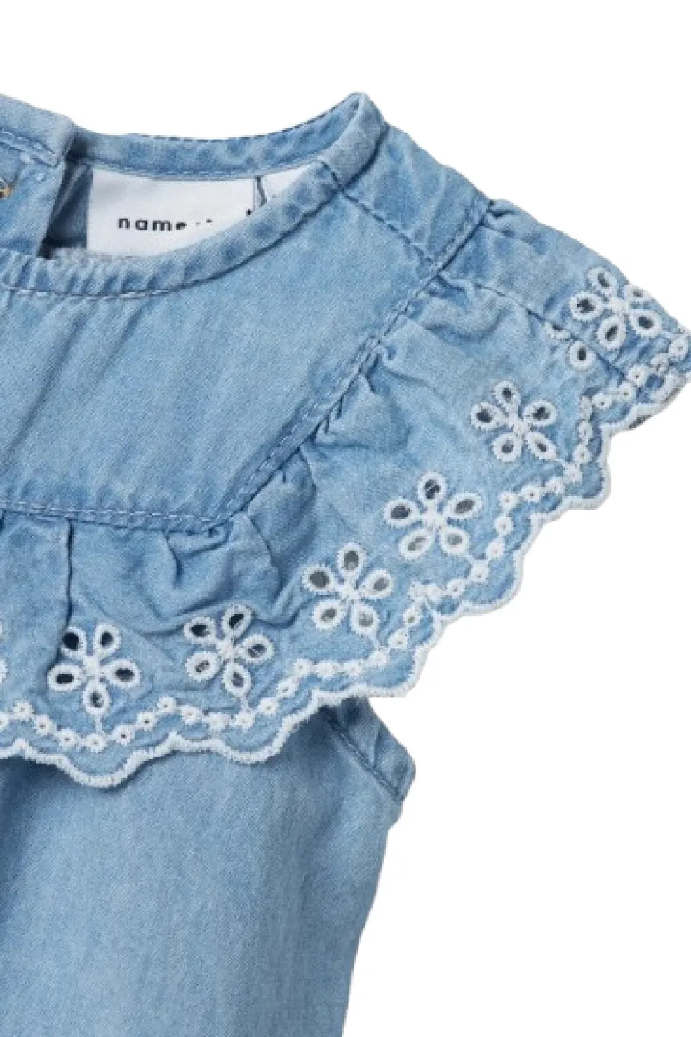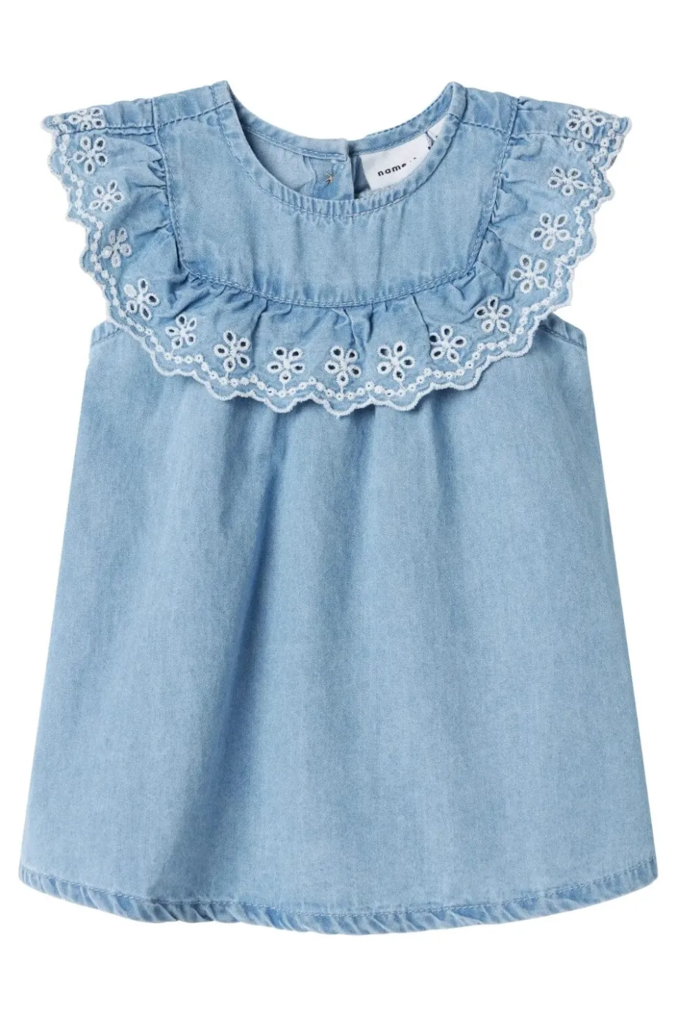 Lyseblå denimkjole fra Name It med broderede detaljer og flæsekanter. Den ærmeløse kjole har en firkantet halsudskæring samt knap- og løkkelukning.