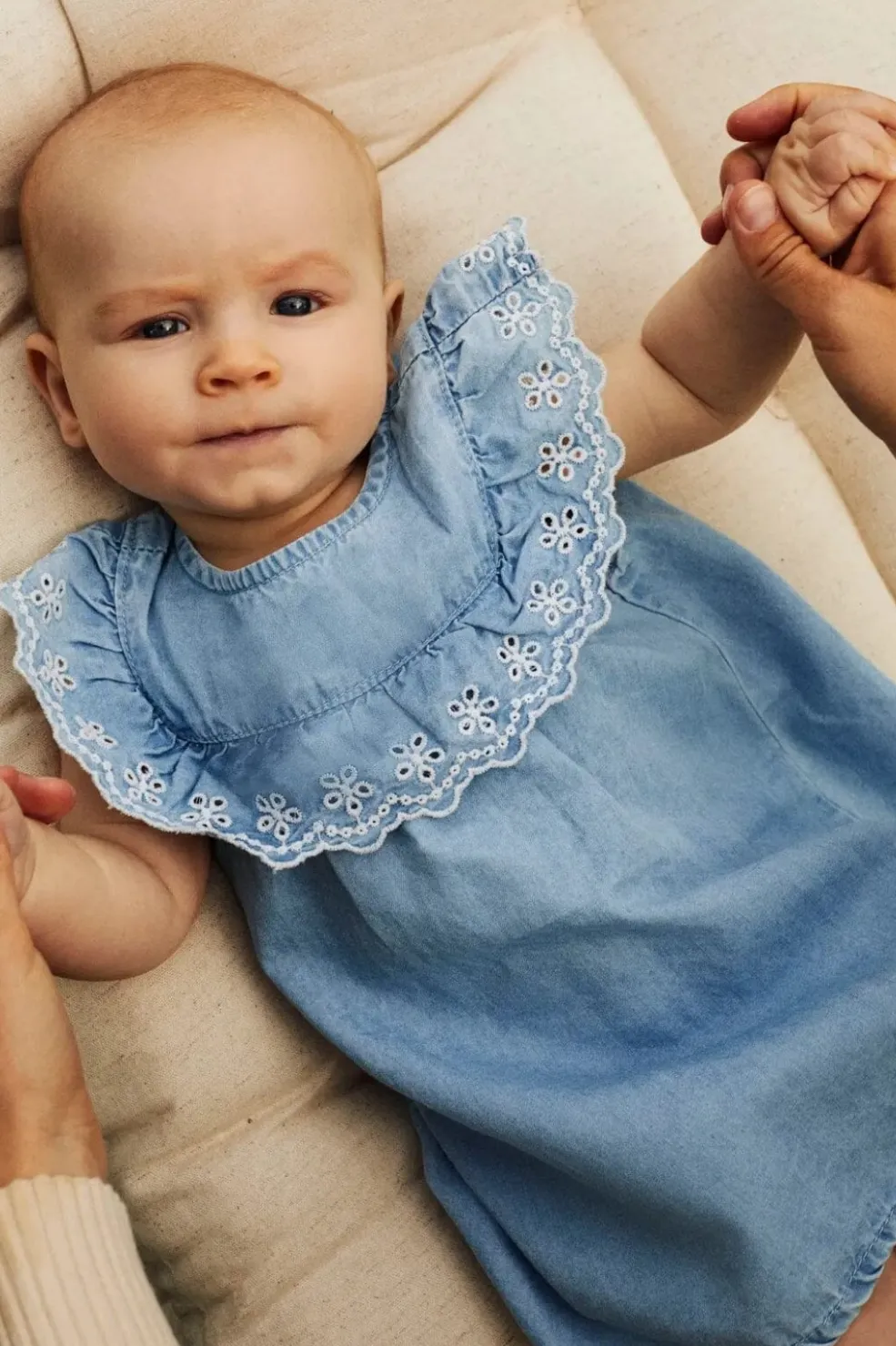 De broderede detaljer og flæsekanter på kjolen skaber fine mønstre i det lyseblå denimstof. Flæserne giver kjolen et blødt udtryk.