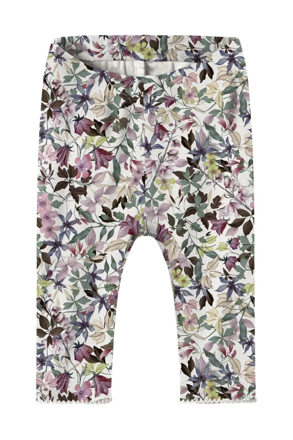 Leggings fra Name It med blomstret mønster i flere farver på hvid baggrund. Fremstillet af blødt jerseystof med blonde-detaljer og elastisk talje.