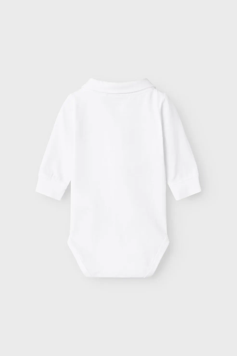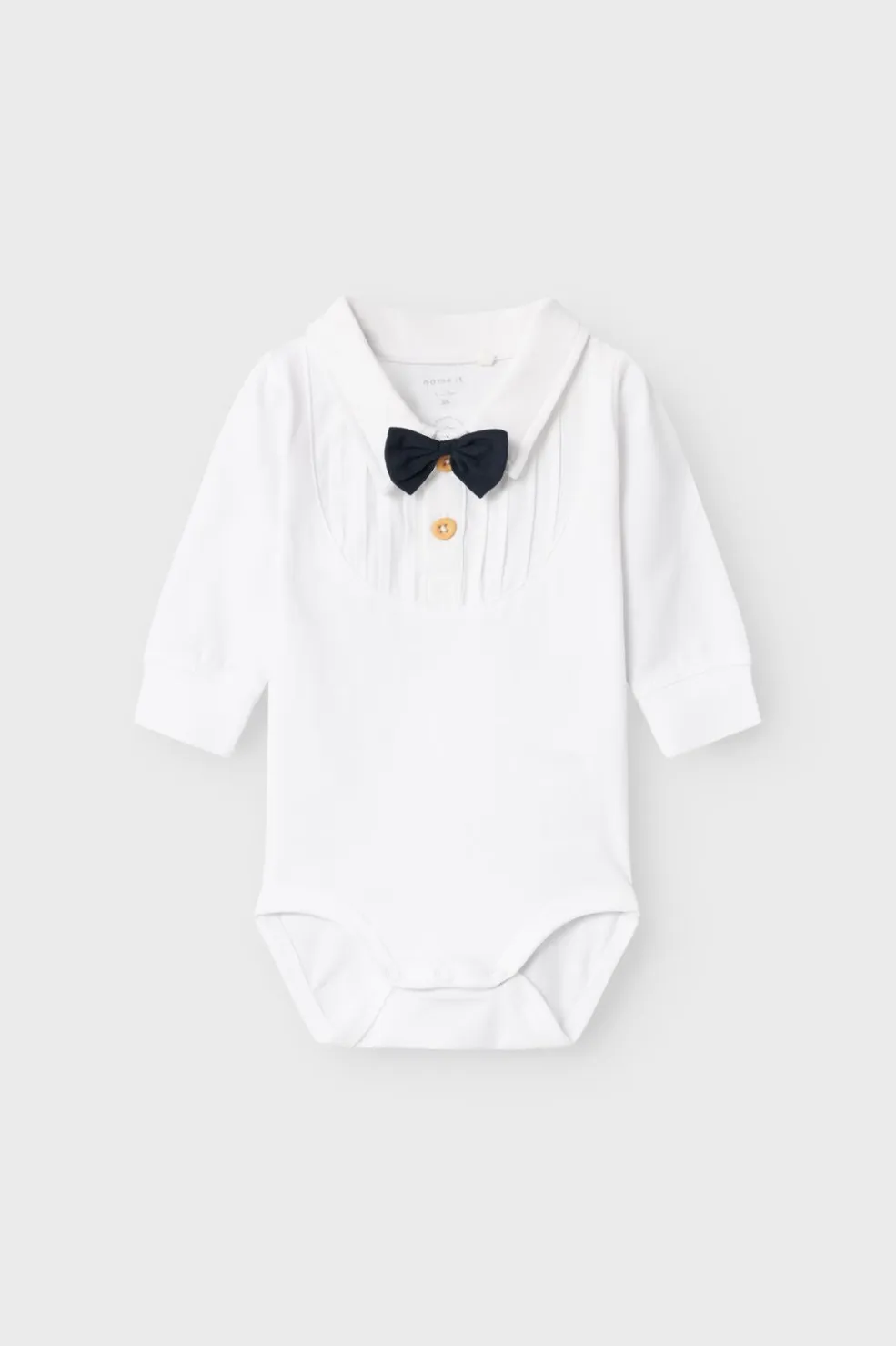 Hvid polobody fra Name It med skjortekrave og sort butterfly. Bodyen har lange ærmer og er fremstillet i en blød og strækbar jersey med plisseret front.