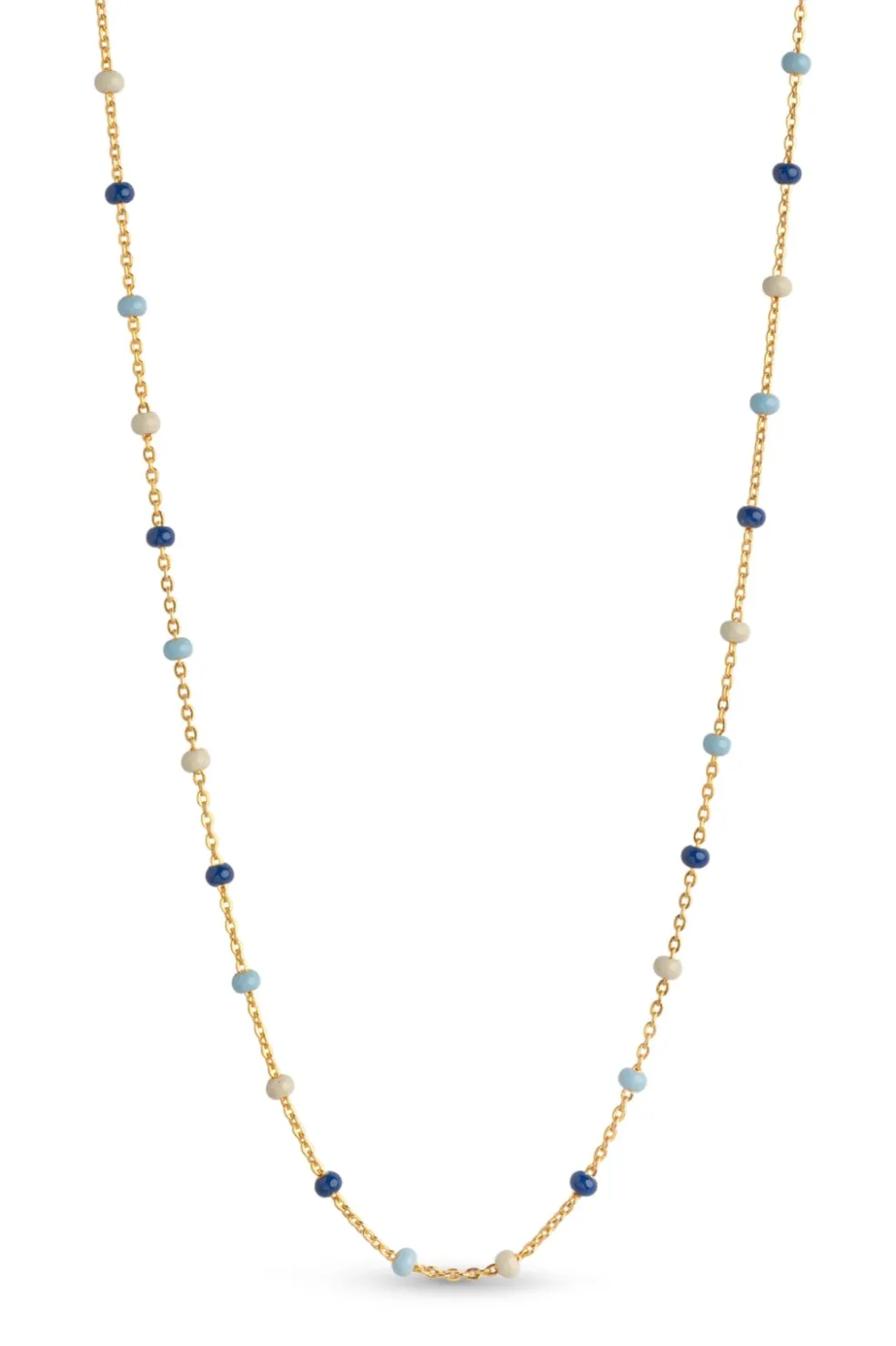 Marinefarvet halskæde fra Enamel Copenhagen med blå og cremefarvede perler på en guldbelagt kæde. Halskæden har små emaljedetaljer og fås i flere farver.