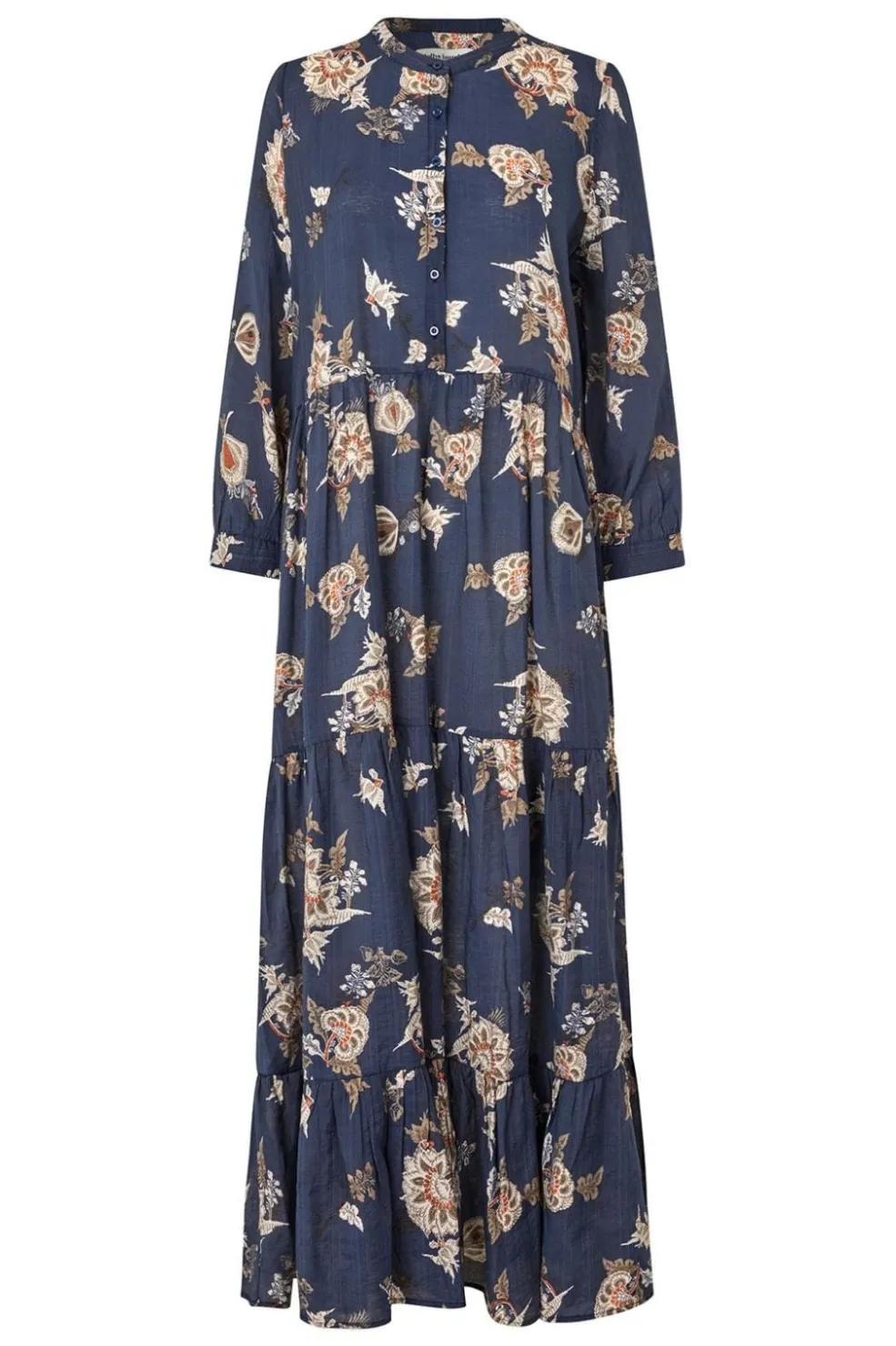 Mørkeblå maxikjole fra Lollys Laundry med blomstermønster i beige og orange nuancer. Kjolen har skjortekrave, knapper foran og et tieret design med flæser.