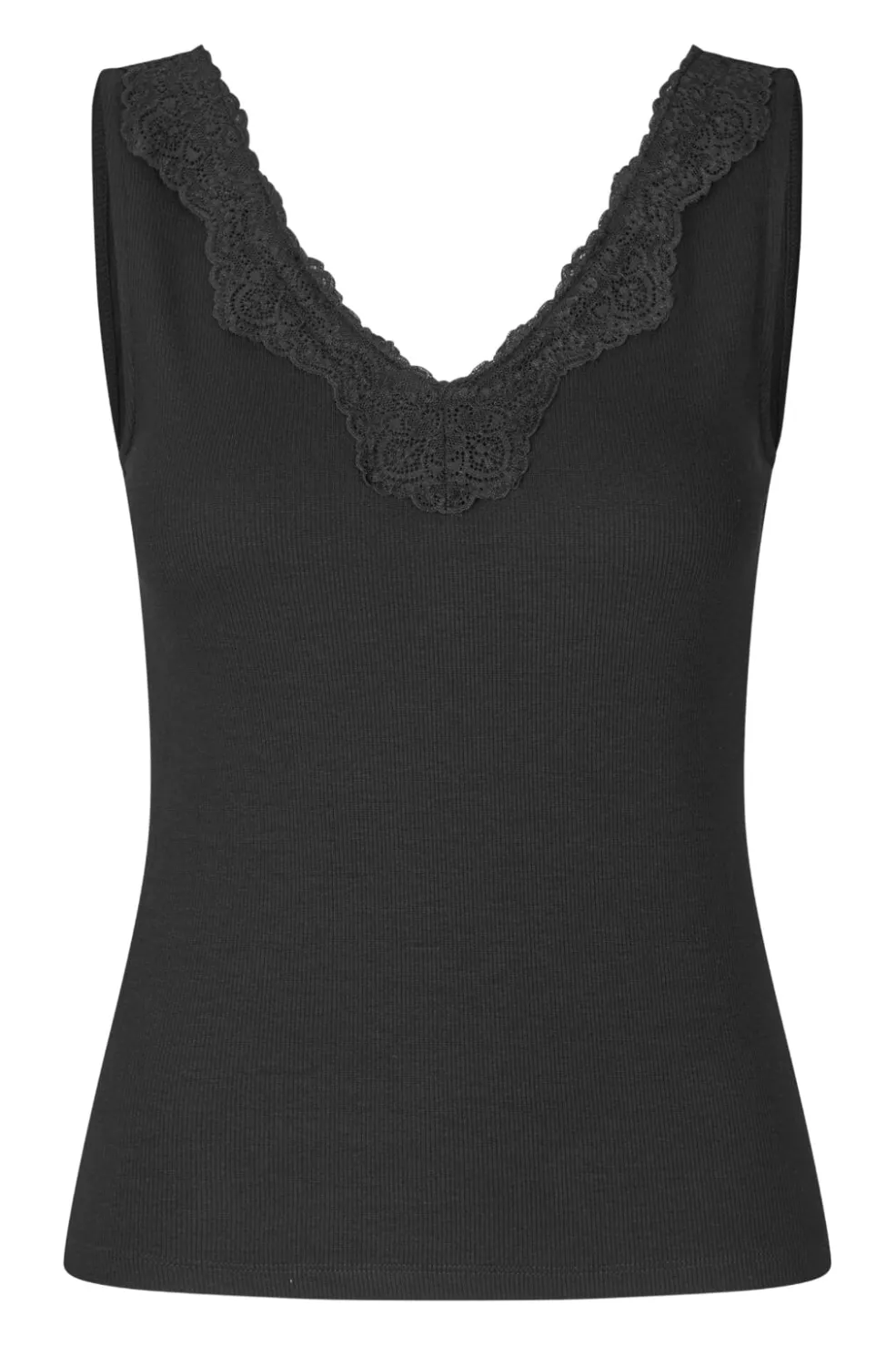 Sort top i ribbet jersey med V-udskæring. Designet har blondekant langs udskæringen og er uden ærmer. Toppen er fremstillet i en blød og strækbar kvalitet.