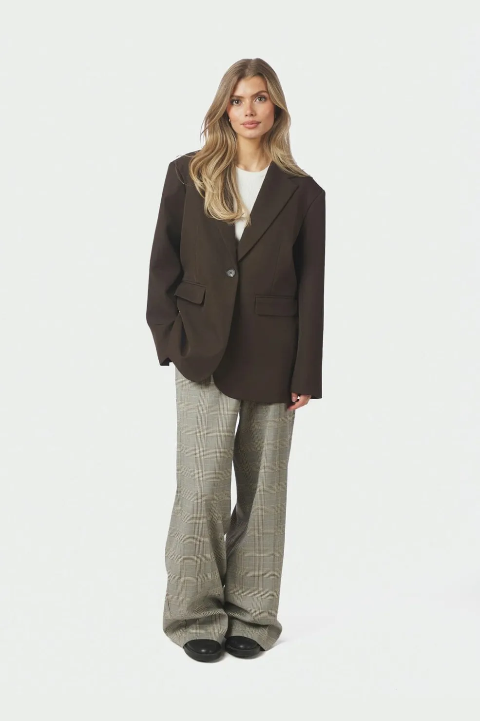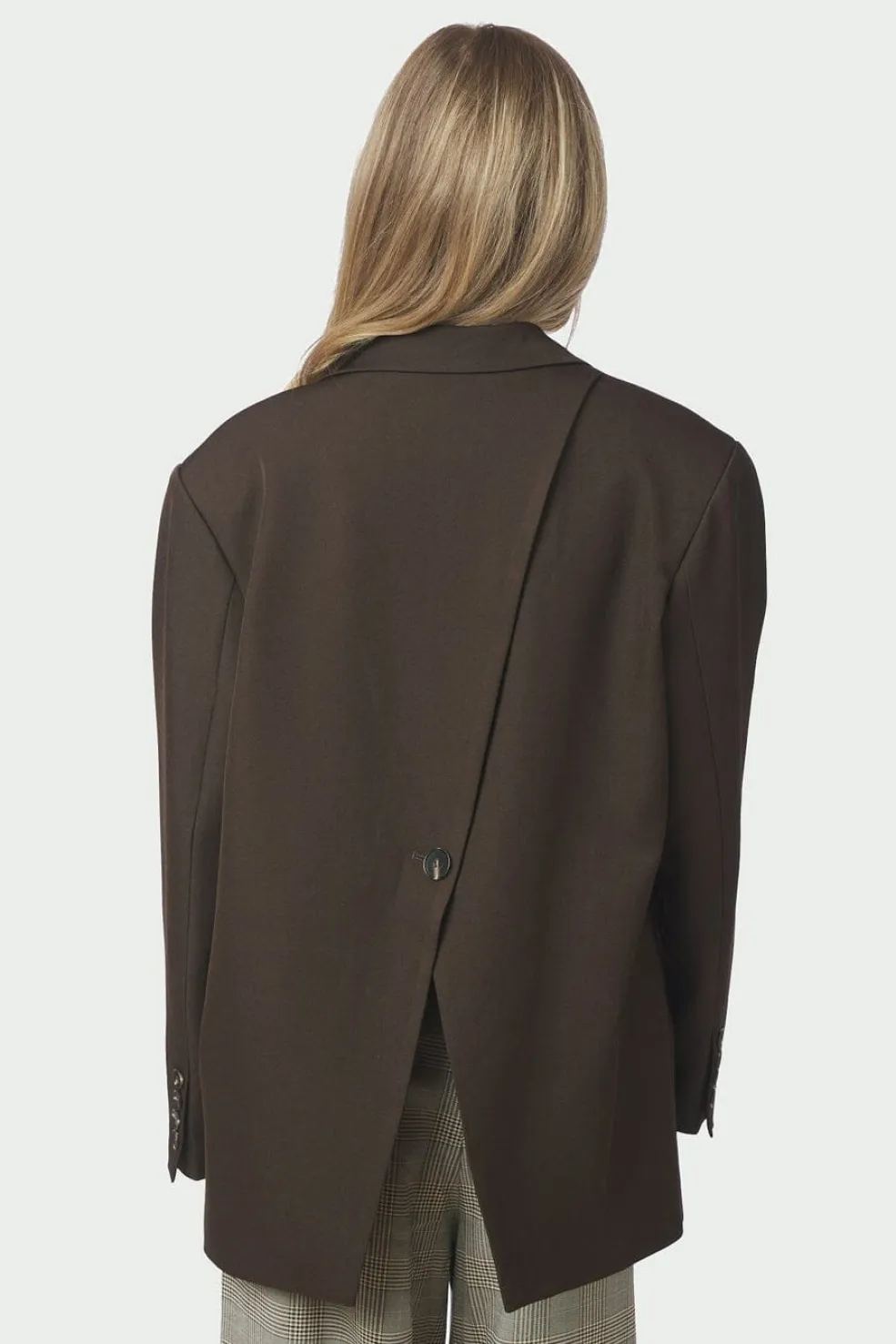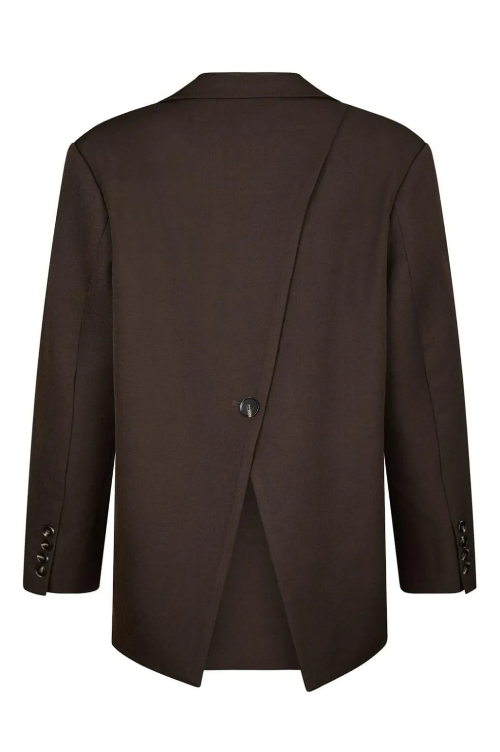 Mørkebrun blazer fra Neo Noir med enkelttradet knaplukning og en asymmetrisk åbning bagpå. Blazeren har lange ærmer og en oversized pasform.