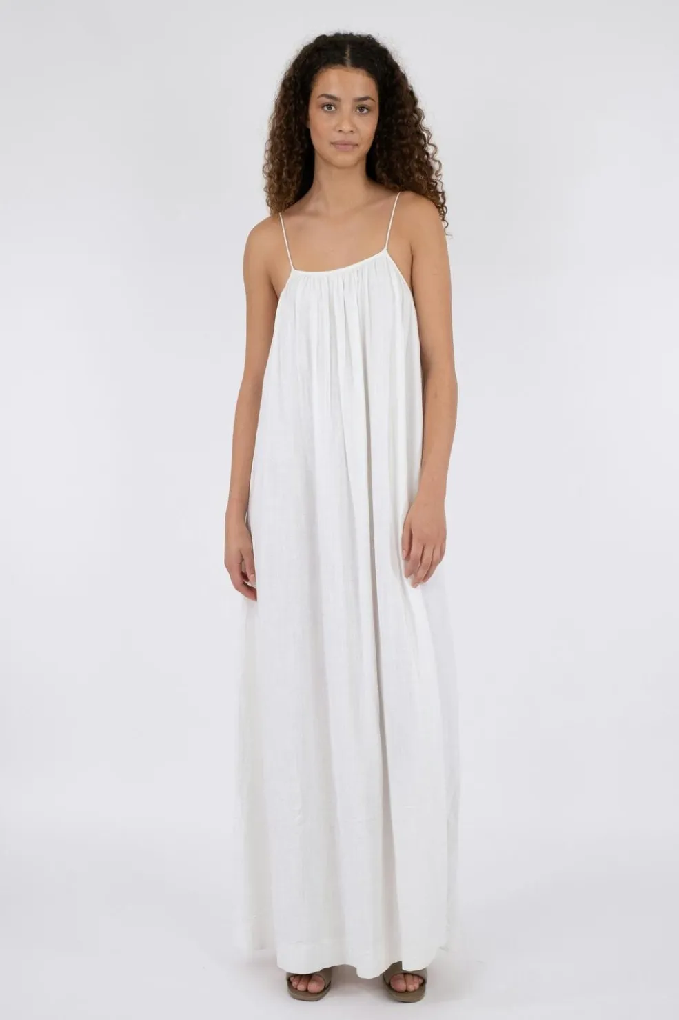 Hvid kjole fra Neo Noir med tynde stropper og løs pasform. Kjolen har en elastisk ryg og flæsedetaljer, der giver den et let og luftigt udtryk.
