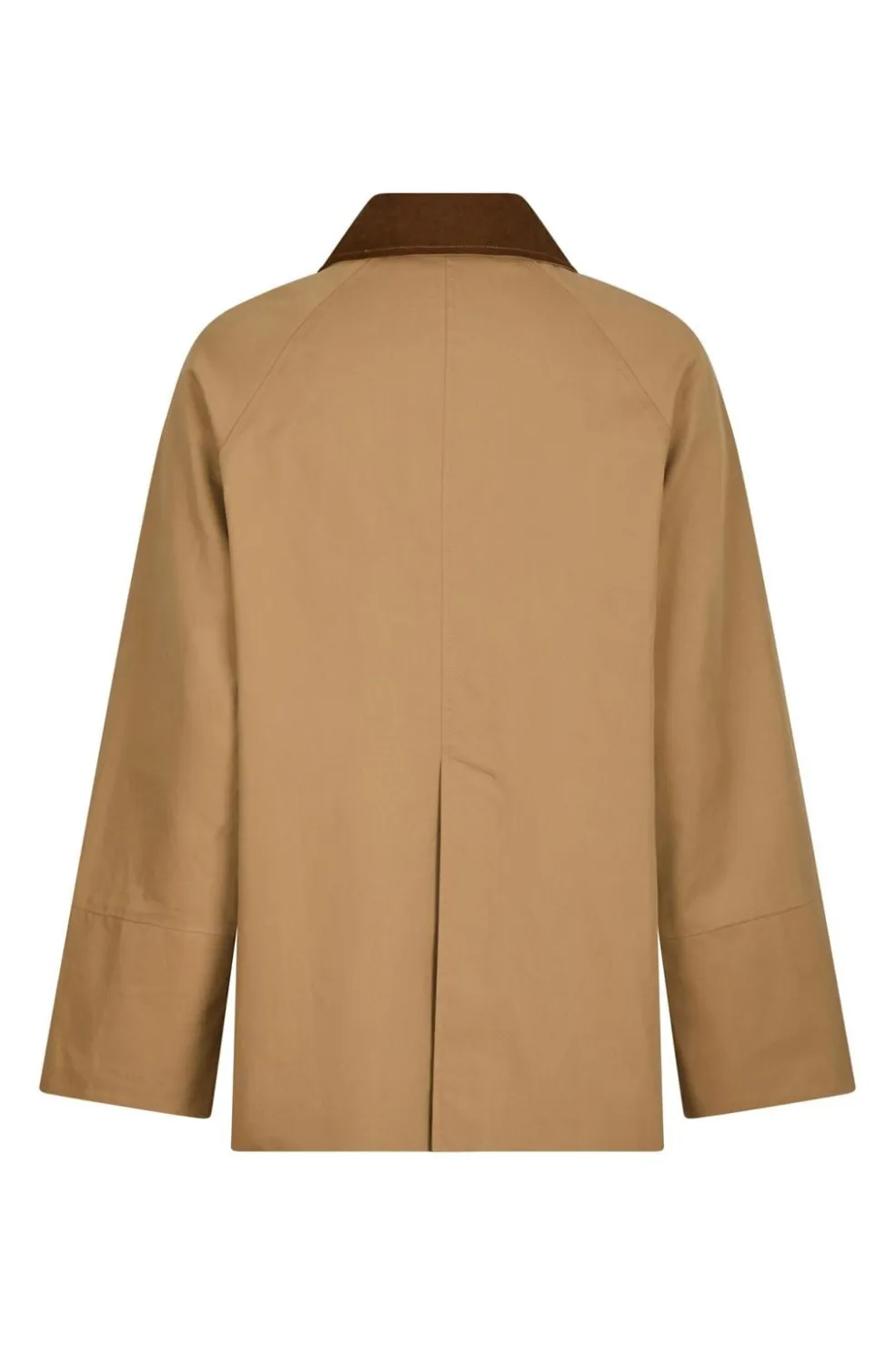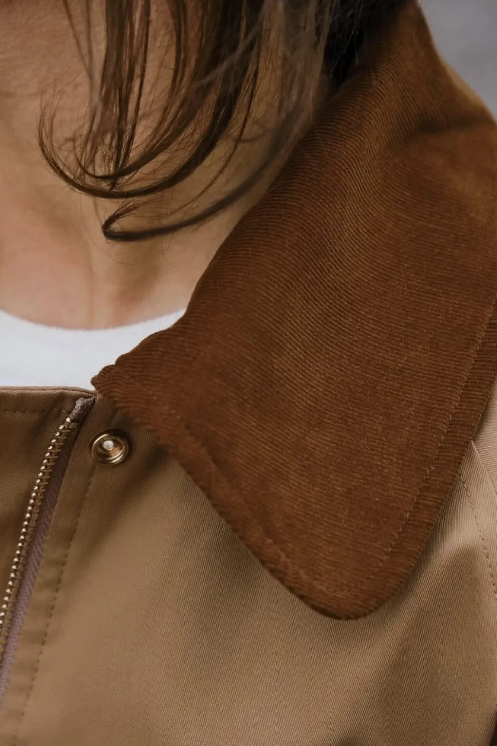 Brun jakke fra Neo Noir med corduroy-krave og 3/4 ærmer. Jakken har en afslappet pasform og praktiske lommer på forsiden. Lynlåsen og trykknapperne gør den nem at lukke.