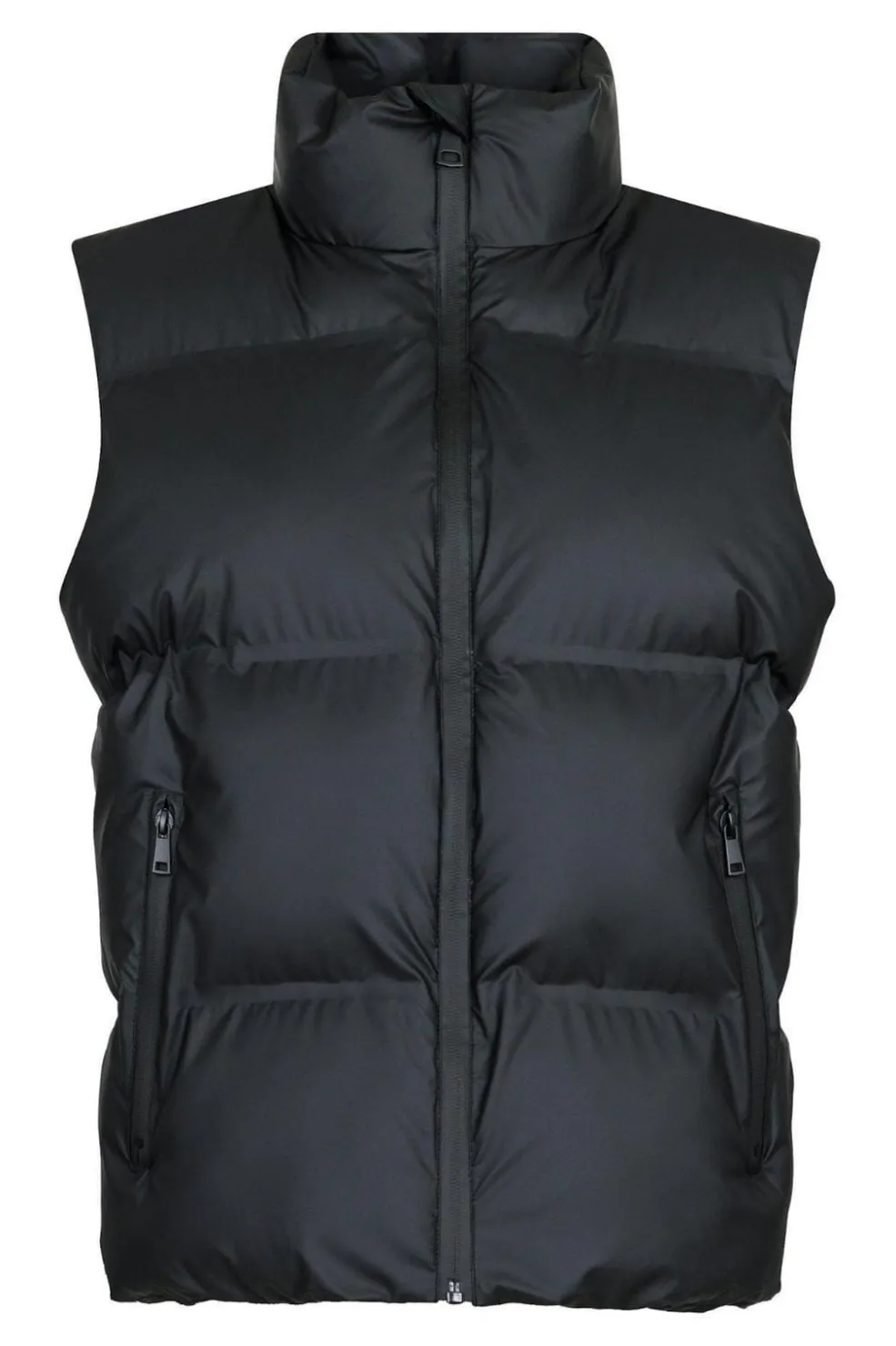 Sort vest fra Neo Noir med vatteret design og høj hals. Vesten har en vandafvisende overflade og en blød, mat kvalitet med quiltet syning.