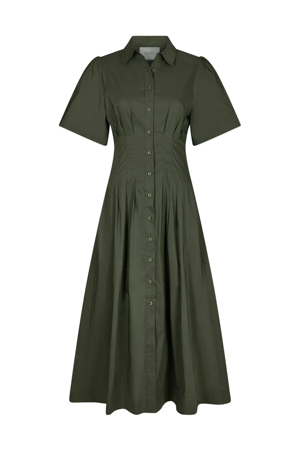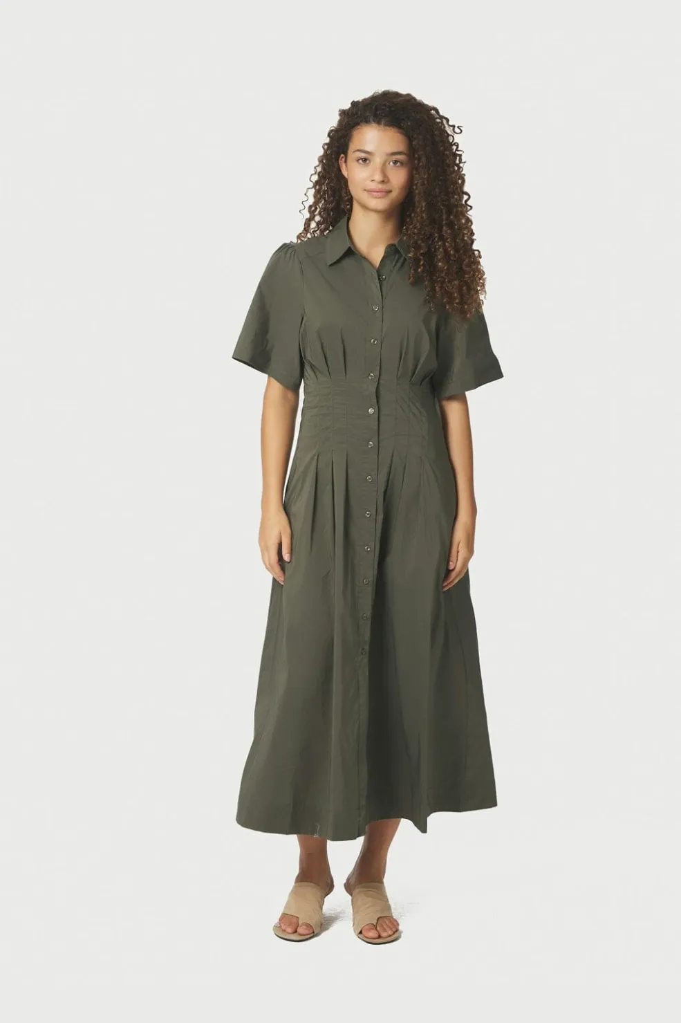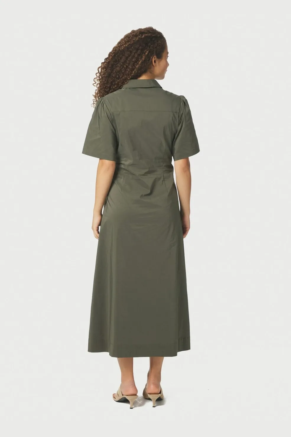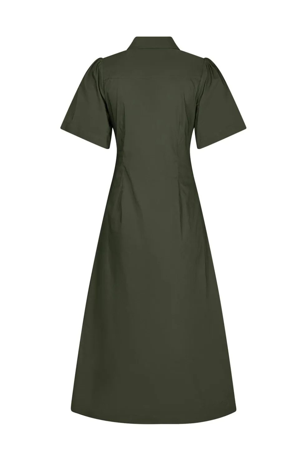 Poplin-kjole fra Neo Noir i armygrøn. Kjolen har en figursyet pasform med korte puffærmer og en knaplukning foran, der går hele vejen ned.