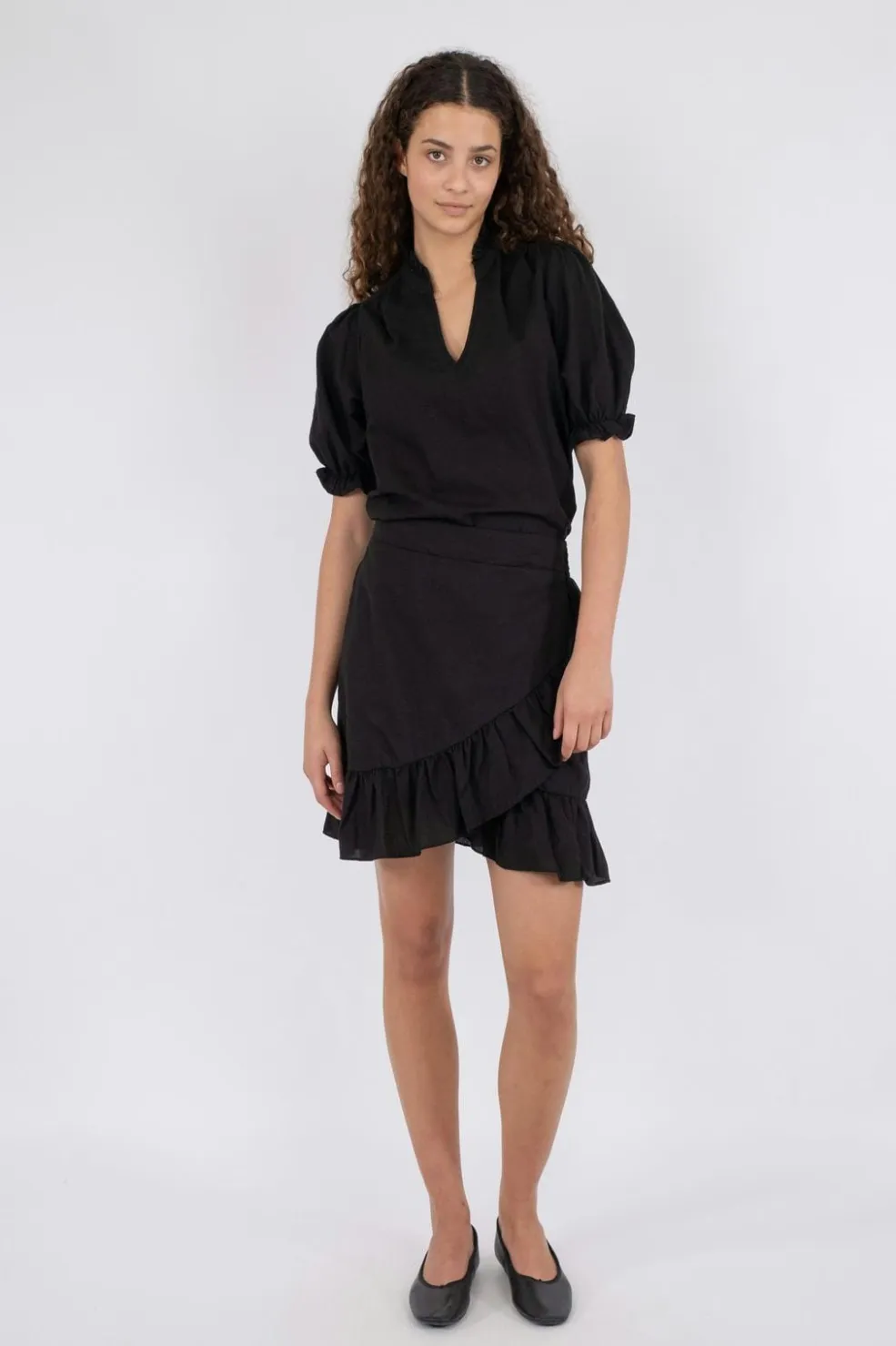 Sort nederdel fra Neo Noir i en blanding af bomuld og hør. Nederdelen har flæsekant i bunden og elastik med snøre i taljen.