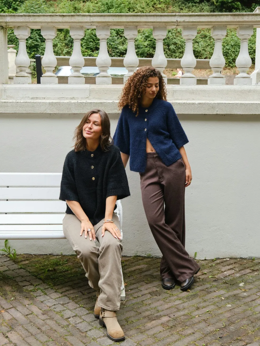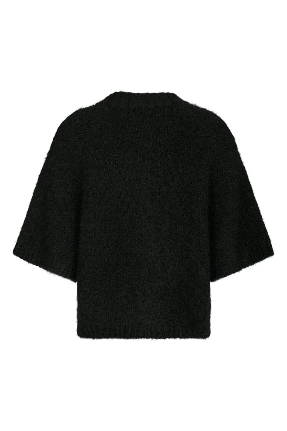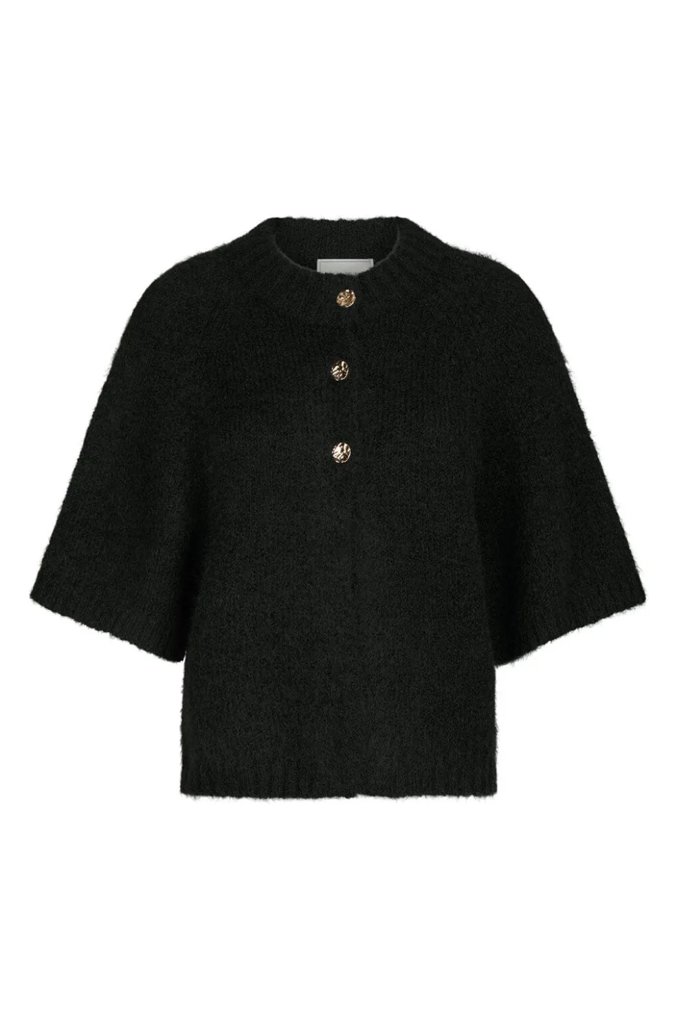 Sort cardigan fra Neo Noir i en blød, fluffy strikkvalitet. Den har en løs pasform med boxy silhuet og korte ærmer. Gyldne knapper pryder forsiden.