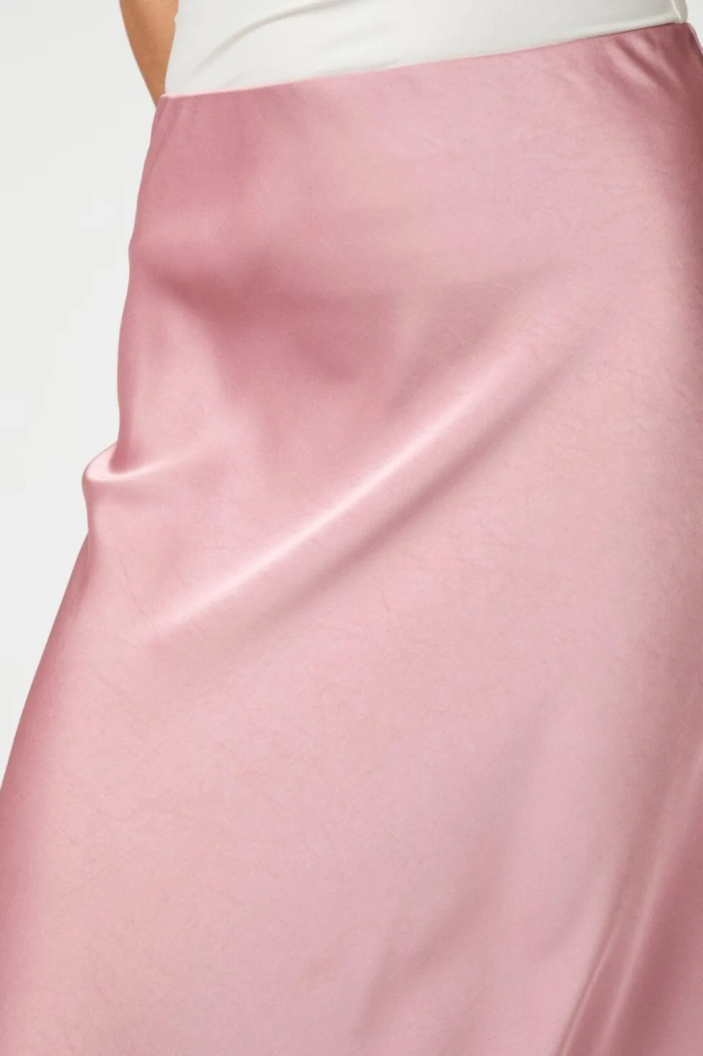 Lyserød satin-nederdel fra Neo Noir med skrå skæring. Den bløde satin har en let glans, og nederdelen når til læggene. Elastik i taljen giver god bevægelighed.