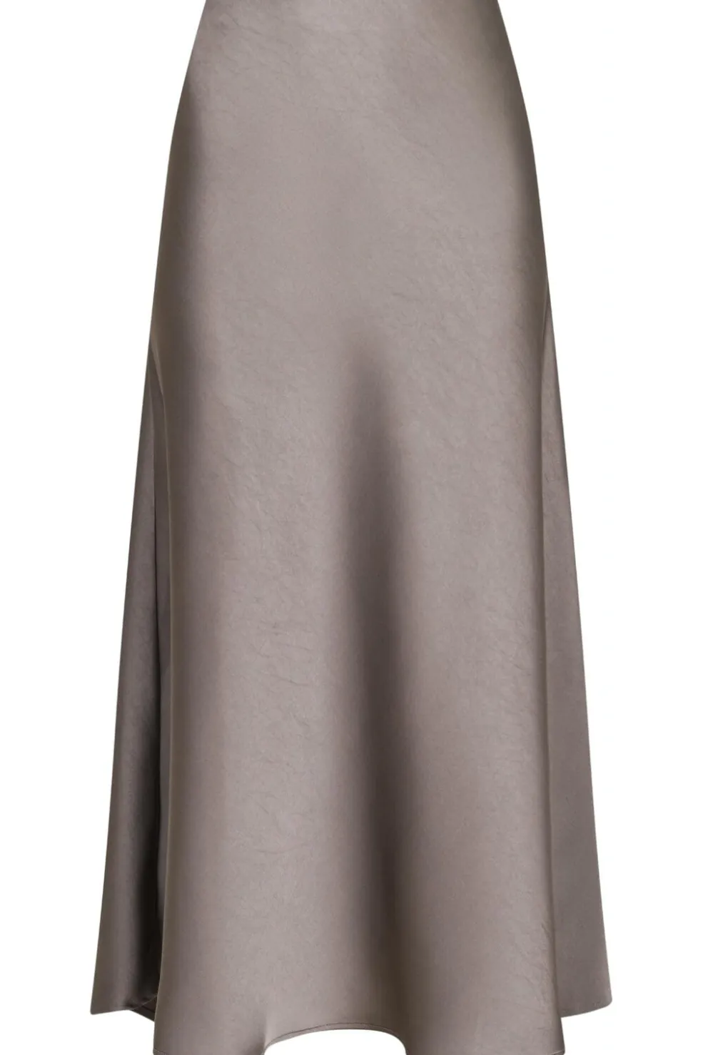 Varm grå nederdel fra Neo Noir i blød satin med skrå skæring. Den har en skinnende overflade og går til midt på læggen.