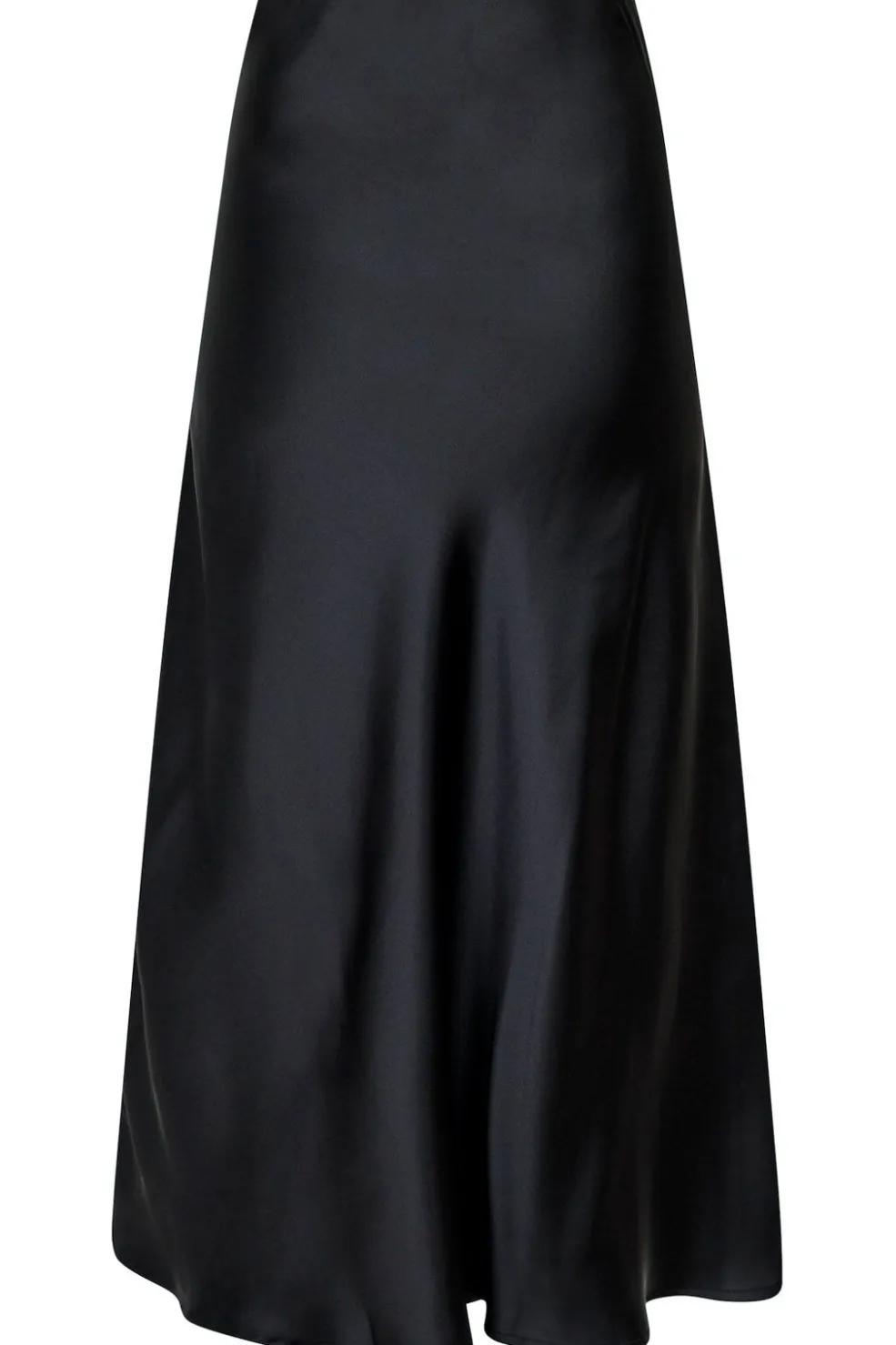 Sort satin-nederdel fra Neo Noir med skinnende overflade. Den går til midt på skinnebenet og har en løs pasform med elastik i taljen.