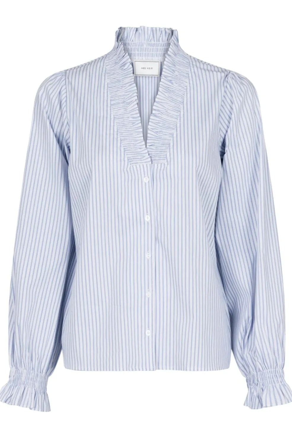 Stribet skjorte fra Neo Noir i hvid og lyseblå. Skjorten har rynkede detaljer ved V-udskæringen og feminine smockdetaljer, der giver den et blødt udtryk.
