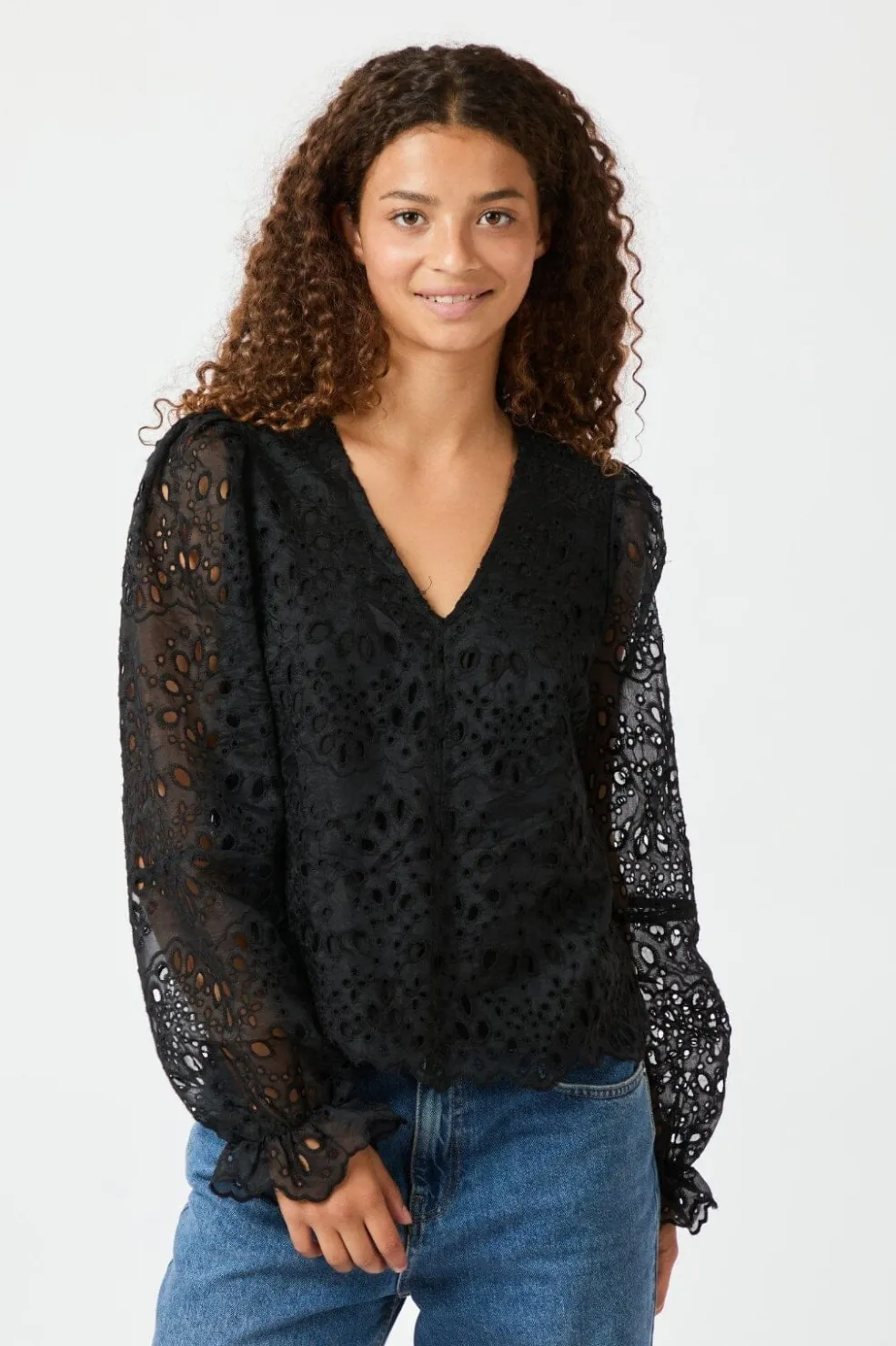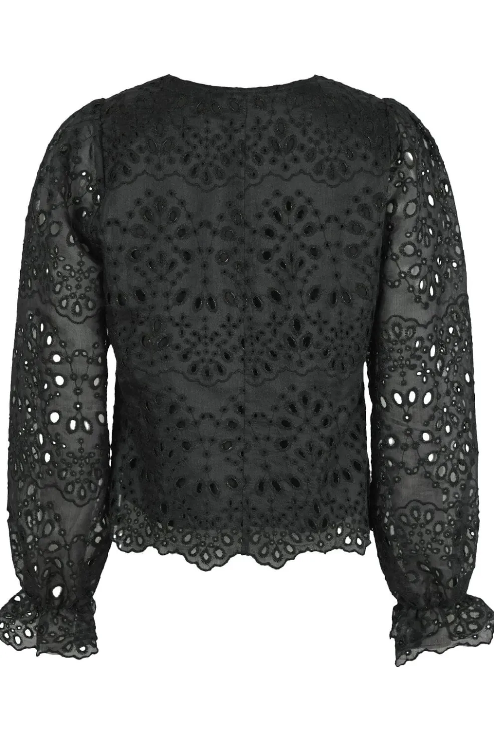 Sort bluse fra Neo Noir med broderede blomster- og cirkelmønstre. Blusen har en V-hals og lange pufærmer med et romantisk snit.