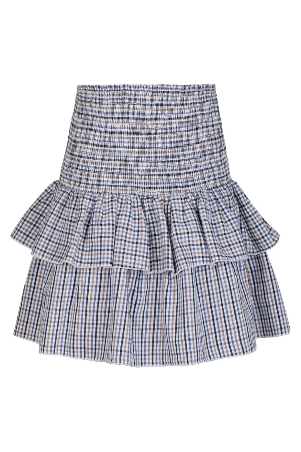 Ternet nederdel fra Neo Noir i blå og hvid. Den har to lag flæser og smockelastik i taljen. Nederdelen går til midt på låret og har et klassisk ternet mønster.