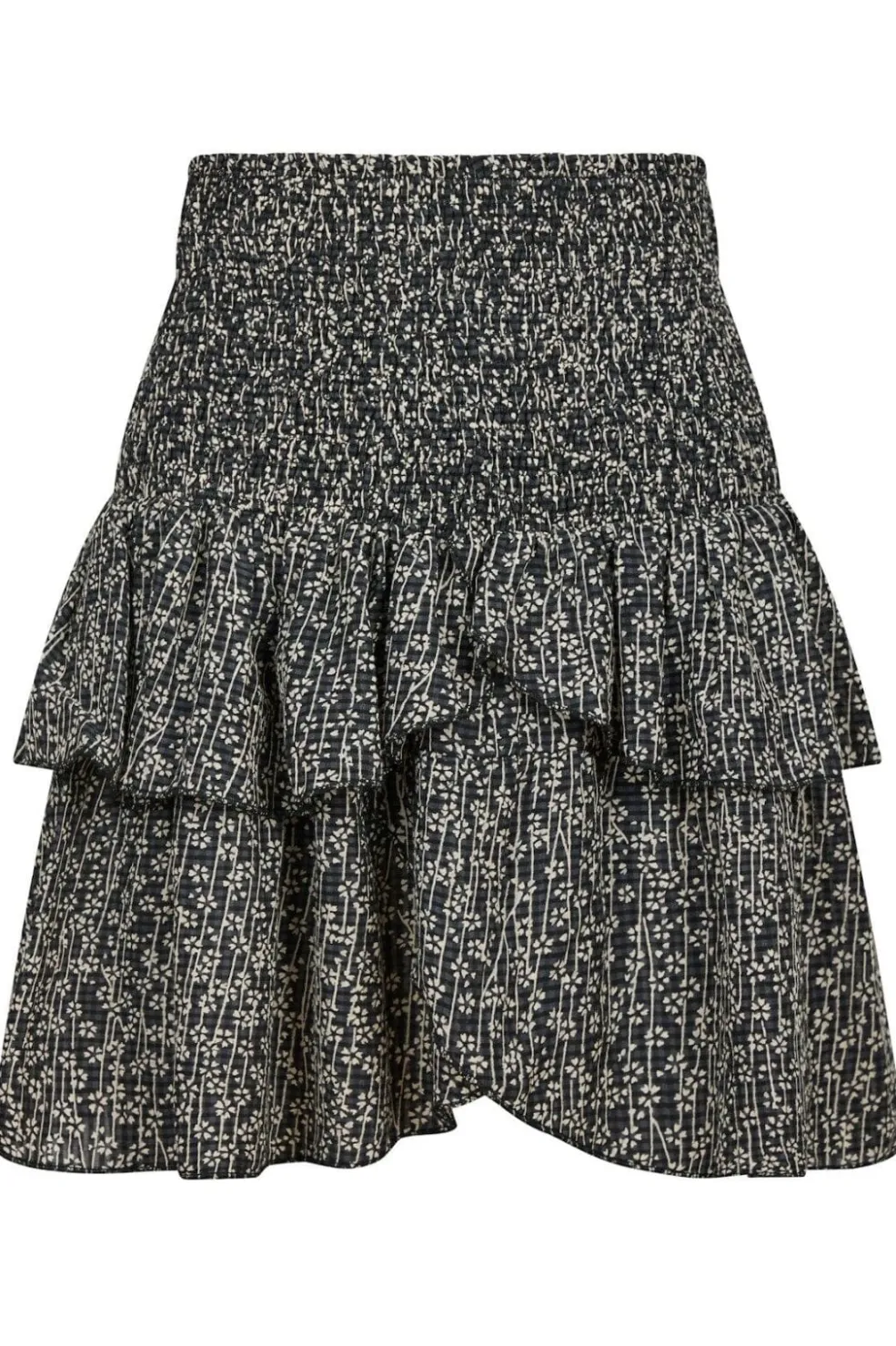 Sort nederdel fra Neo Noir med blomster- og ternet mønster. Den smockede talje og volanger i lag skaber en let og bevægelig silhuet.