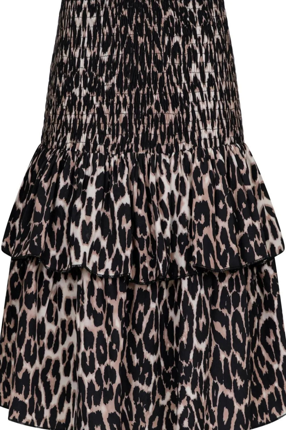 Nederdel fra Neo Noir med leopardmønster i brune og sorte nuancer. Den har smock-elastik i taljen og to lag flæser, der giver bevægelse til designet.