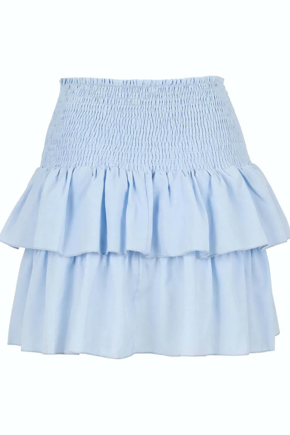 Lyseblå nederdel fra Neo Noir med rynket elastisk talje og dobbelte flæser. Den er fremstillet af genanvendt polyester og har en høj talje med lårlang pasform.