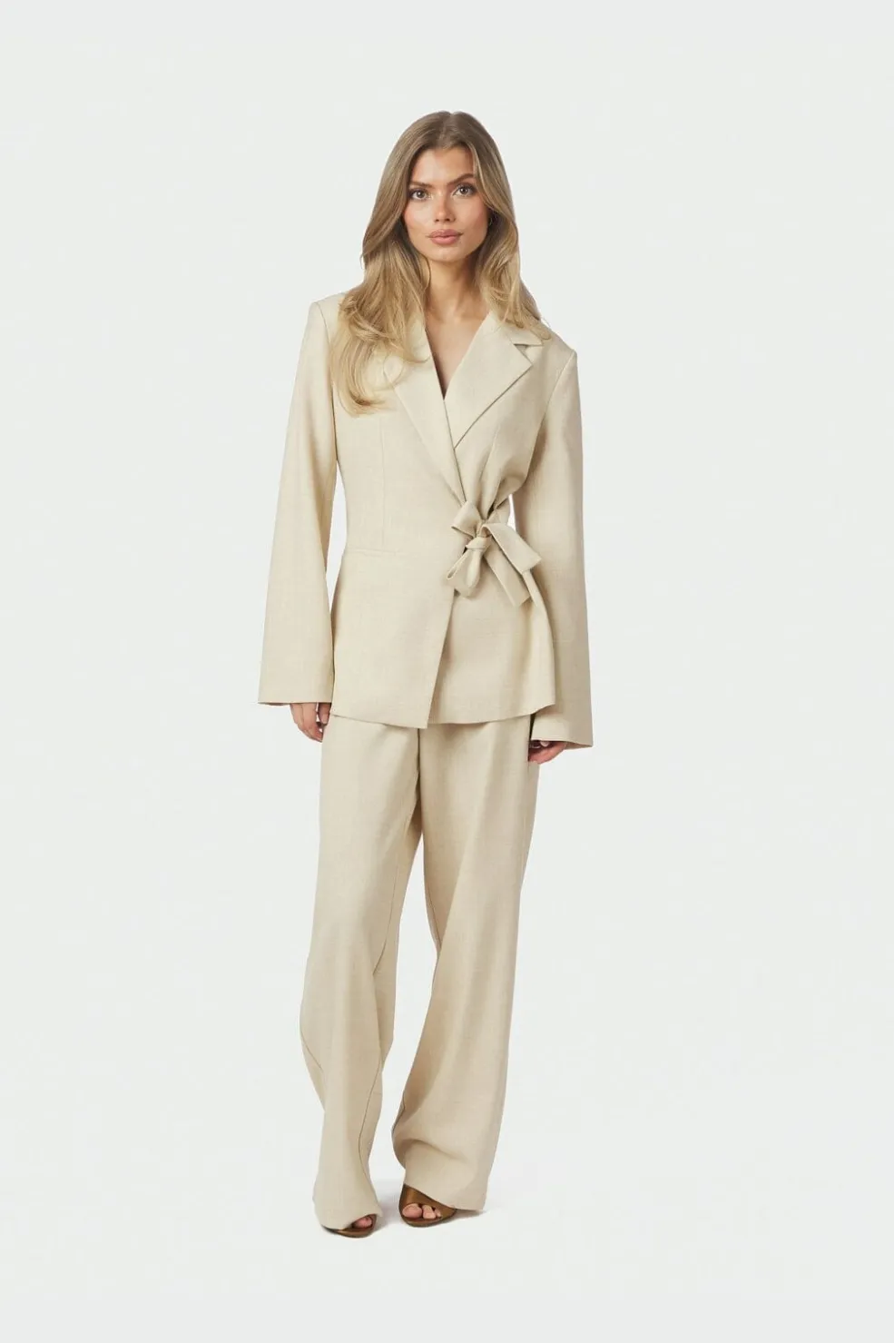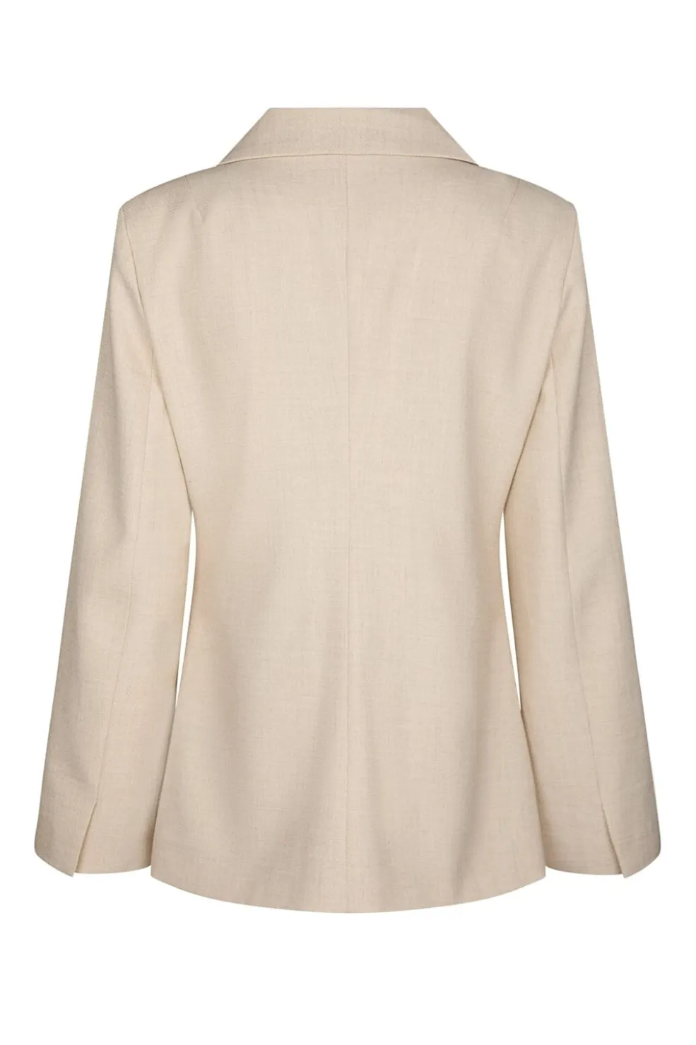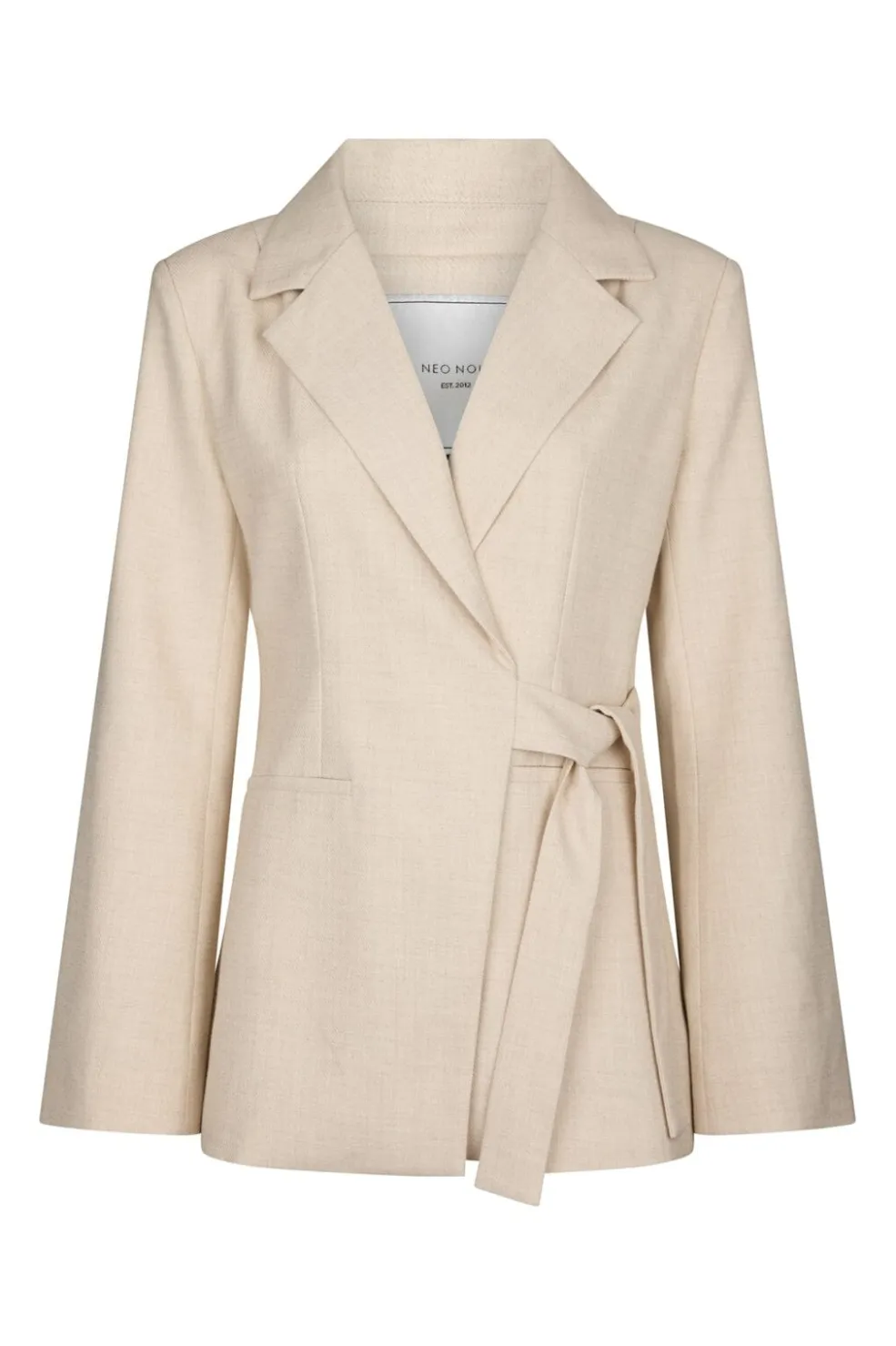 Beige melange-blazer fra Neo Noir med bindebånd i taljen. Blazeren har reverskrave og skrå lukning i siden.