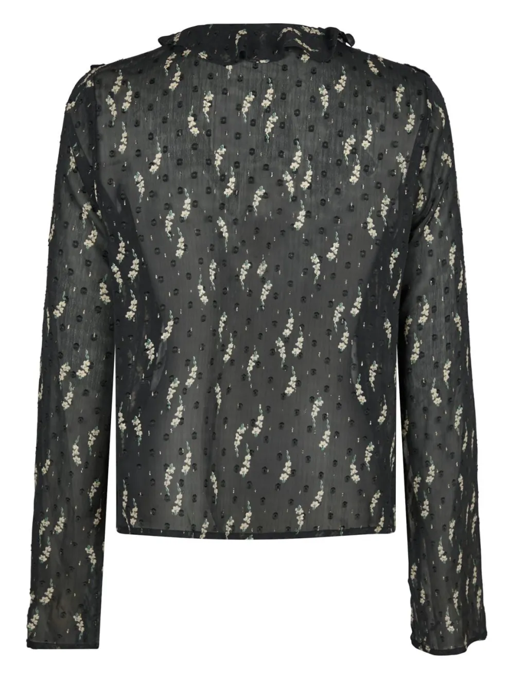 Sort bluse fra Neo Noir med lyse blomstergrene på sort baggrund. Blusen har flæsedetaljer ved halsen og snørelukning foran. De lange ærmer og v-udskæringen giver blusen et feminint udtryk.