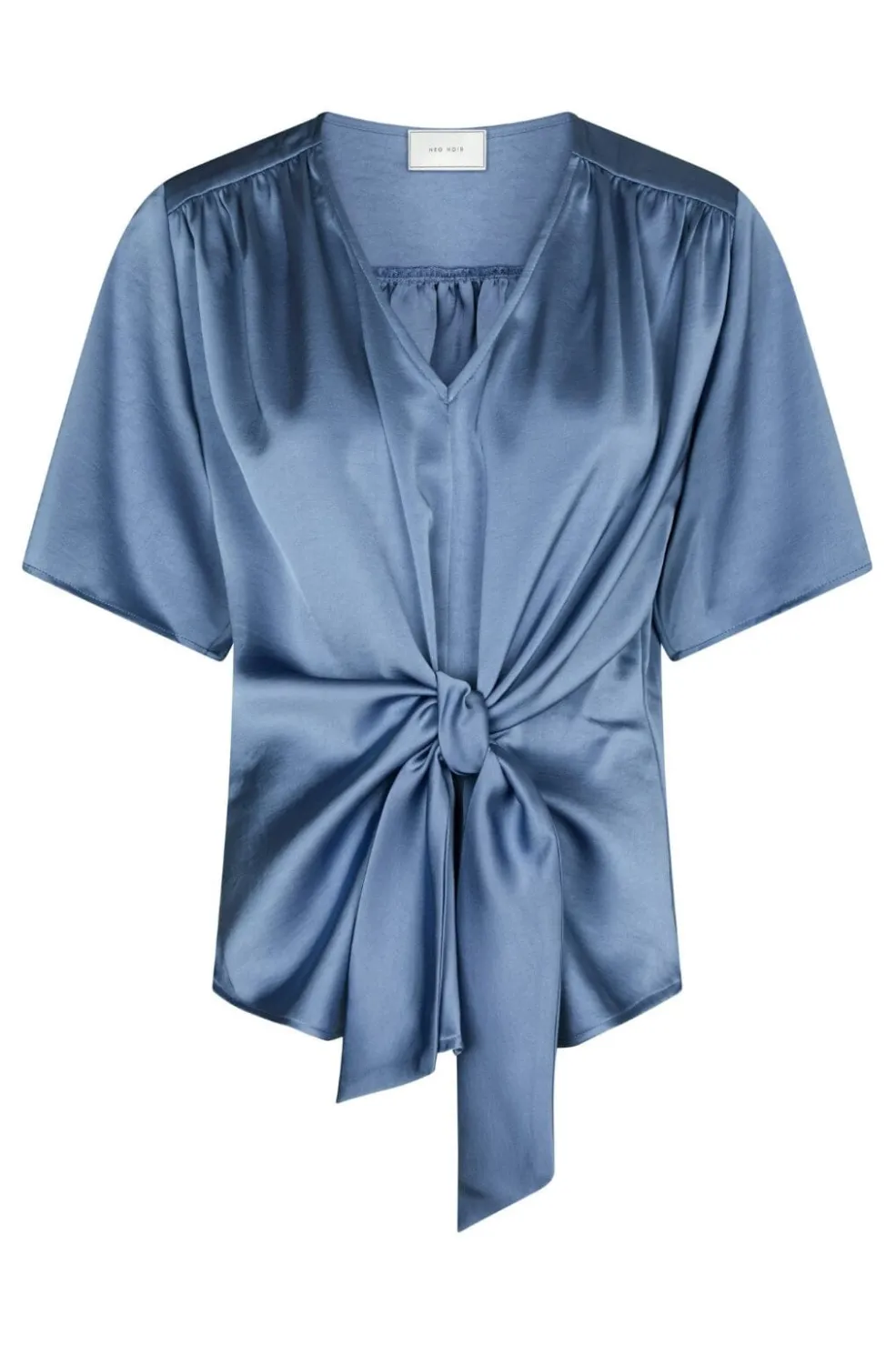Bluse fra Neo Noir i røgblå, tung satinkvalitet. Den har korte ærmer, V-hals og en justerbar knude foran, der giver mulighed for at tilpasse pasformen.
