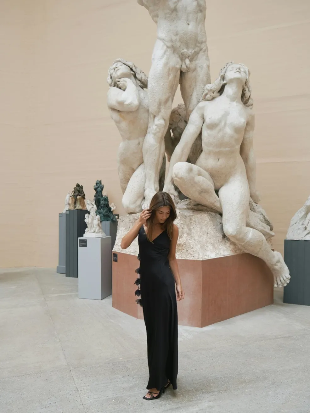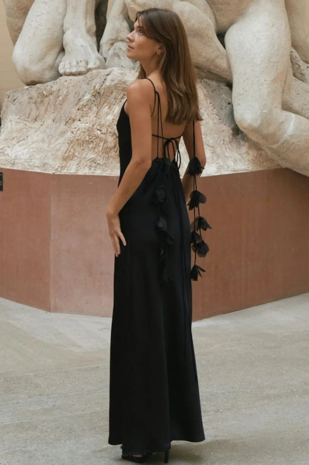 Sort gulvlang kjole fra Neo Noir i tung crepe-satin. Kjolen har V-udskæring, spaghetti-stropper med blomsterdetaljer og bindebånd på ryggen.