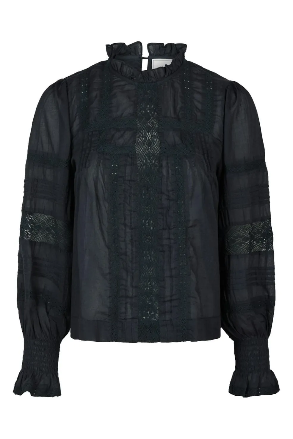 Mørkeblå voile-bluse fra Neo Noir med høj hals og flæser. Blusen har blonder på ærmerne og foran, samt dekorative syninger, der giver et feminint udtryk.