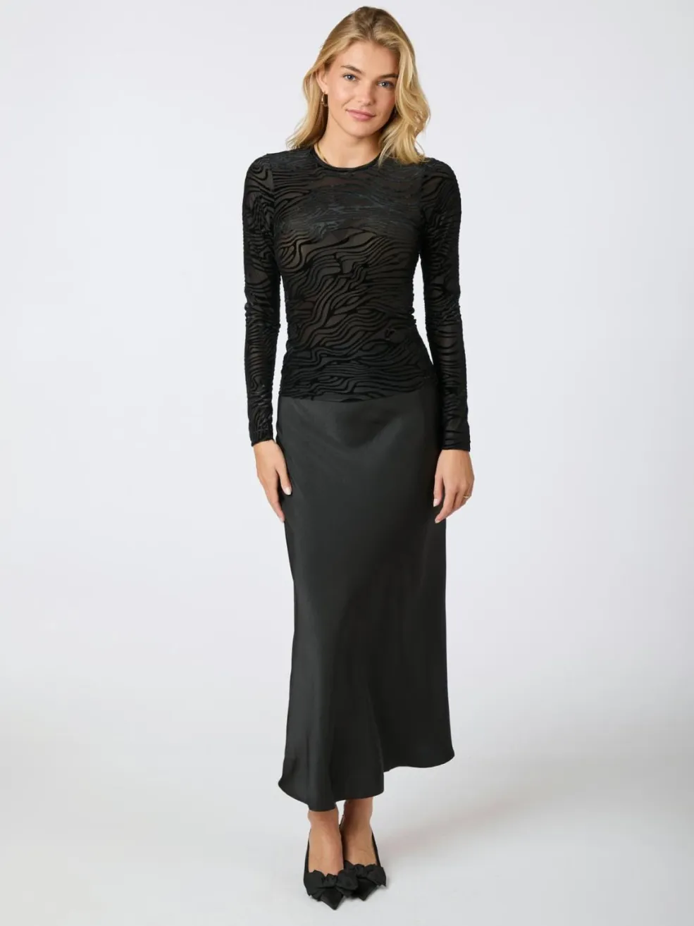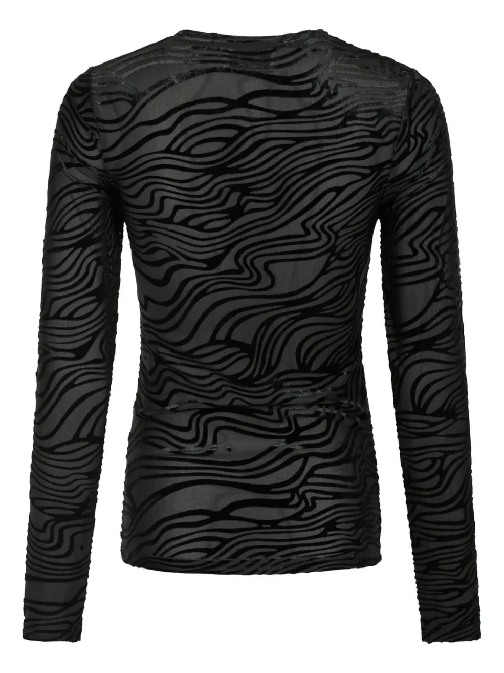Sort bluse fra Neo Noir med zebra burnout-mønster. Blusen har en rund halsudskæring og lange ærmer. Mønsteret skaber en særlig tekstur i stoffet.