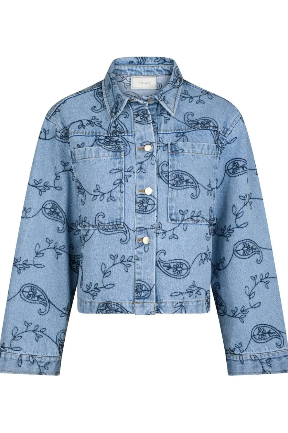 Lyseblå denimjakke fra Neo Noir med broderet paisley-mønster. Jakken har skjortekrave, knapper hele vejen ned og to brystlommer på forsiden.