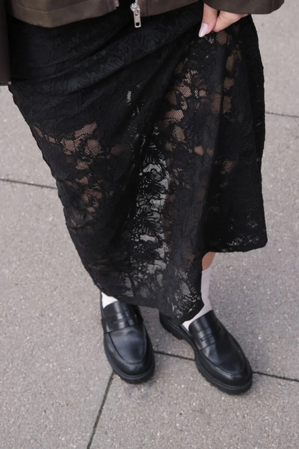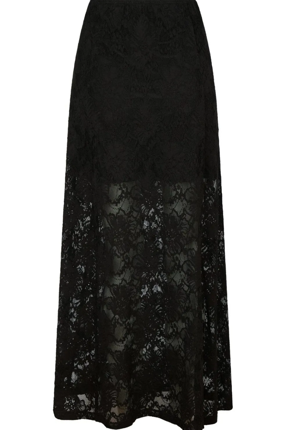 Sort blondenederdel fra Neo Noir med blomstermønster og ankellængde. Nederdelen har en slids i siden og er lavet med elastisk talje.