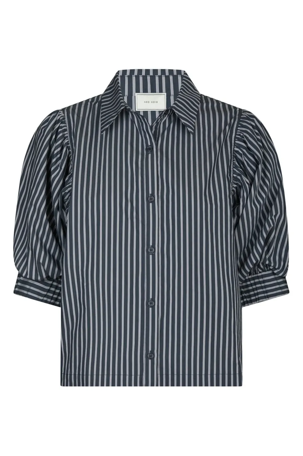 Mørkeblå stribet skjorte fra Neo Noir med korte puffærmer. Skjorten har vertikale striber i mørkeblå og hvid, klassisk skjortekrave og knaplukning foran.