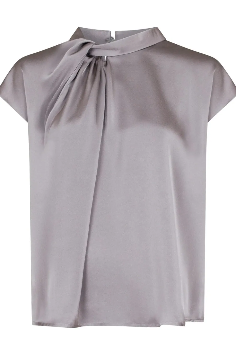 Grå satinbluse fra Neo Noir med høj hals og knudedetalje. Blusen har en løs pasform og korte ærmer, der giver god bevægelsesfrihed.