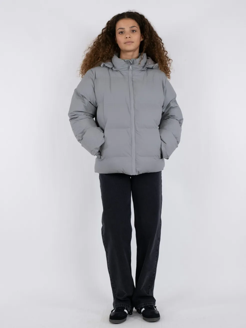 Lysegrå pufferjakke fra Neo Noir med loose fit. Jakken har en høj hals og aftagelig hætte, der beskytter mod vind og regn. Den er lavet i et blødt og mat materiale.
