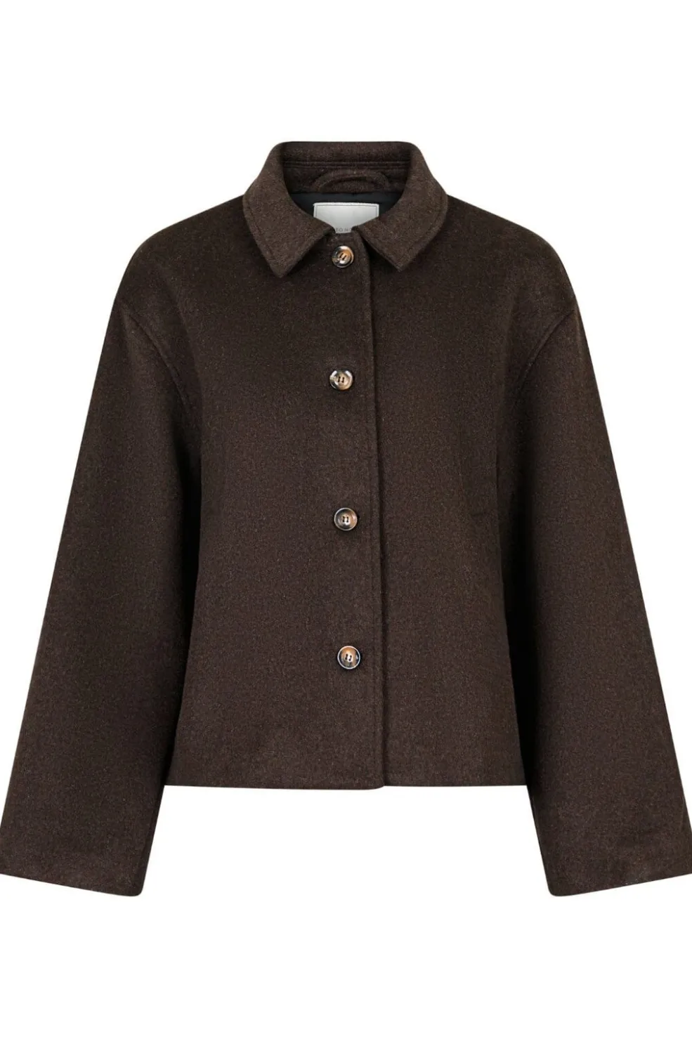 Uldjakke fra Neo Noir i chokoladebrun. Jakken har en løs pasform med skjortekrave og knaplukning foran. Den er fremstillet af en blanding af uld og polyester.