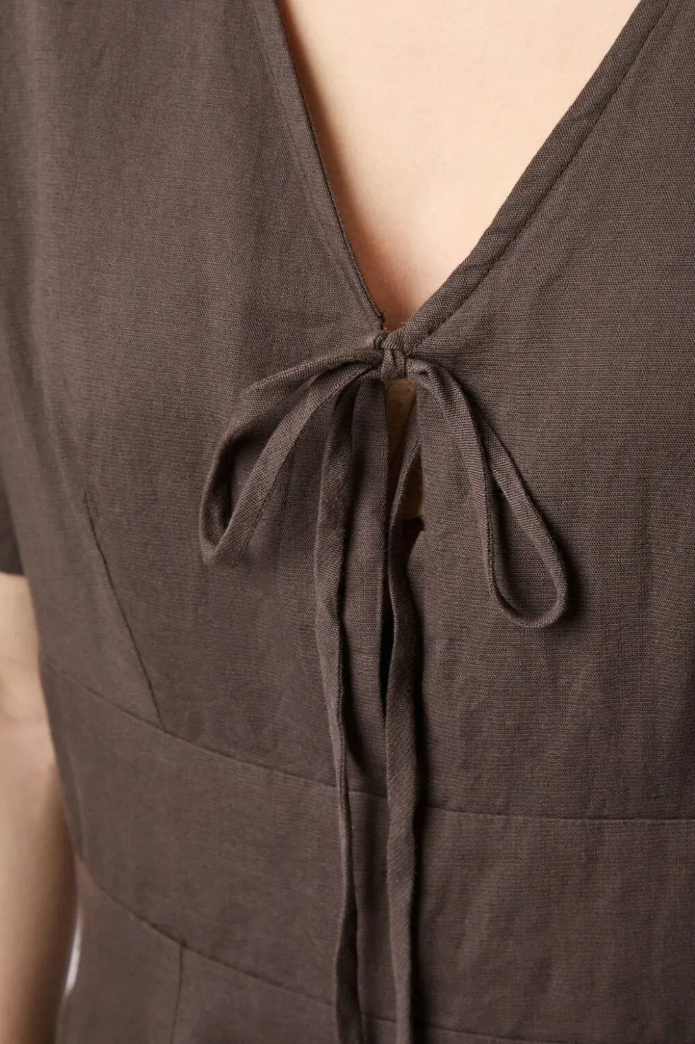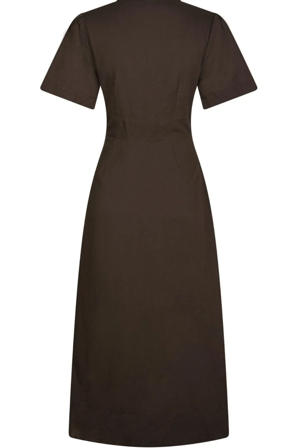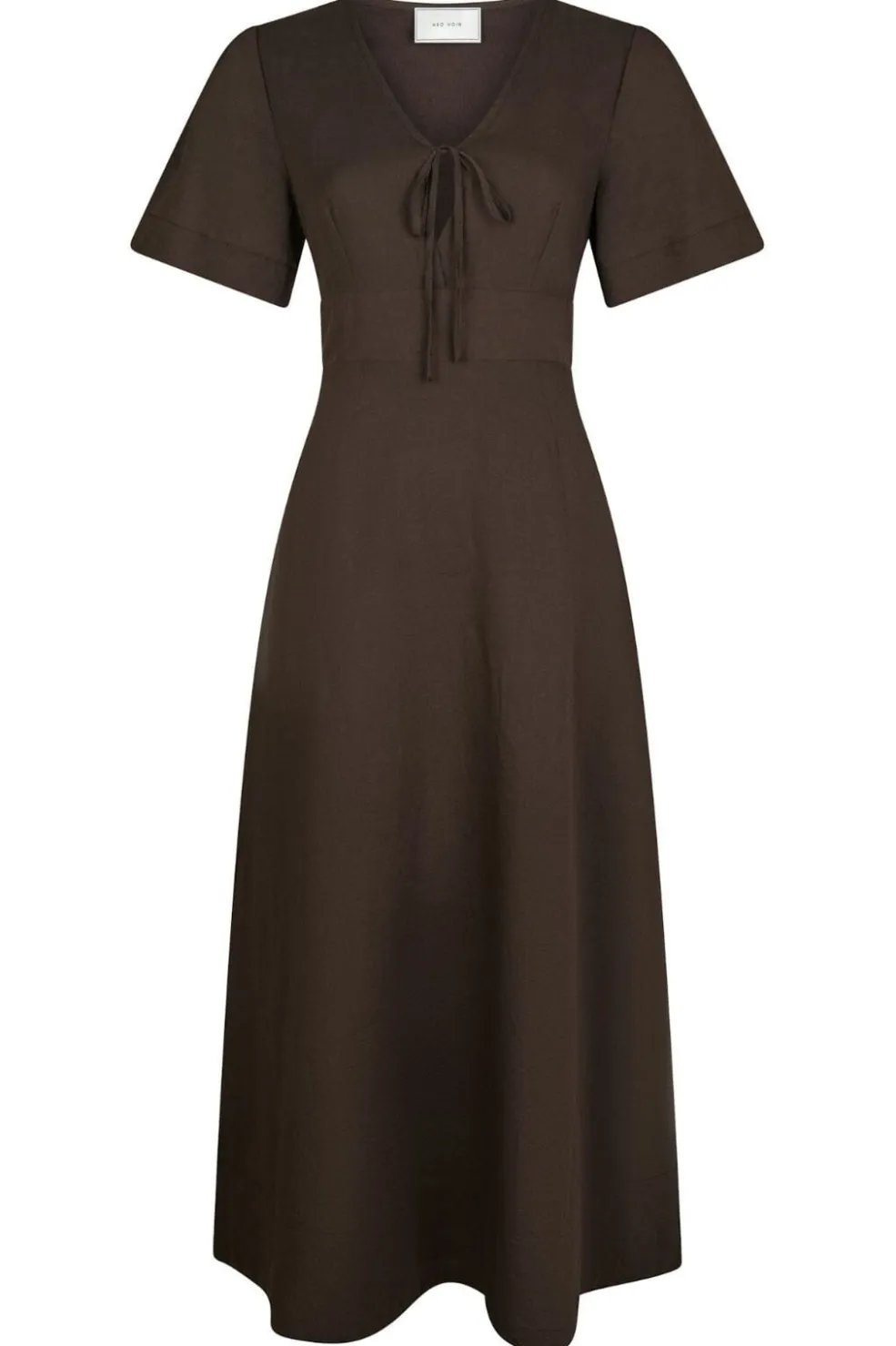 Mørkebrun kjole fra Neo Noir med V-udskæring og bindebånd ved brystet. Den lange kjole har korte ærmer og er fremstillet i en blanding af bomuld og hør.