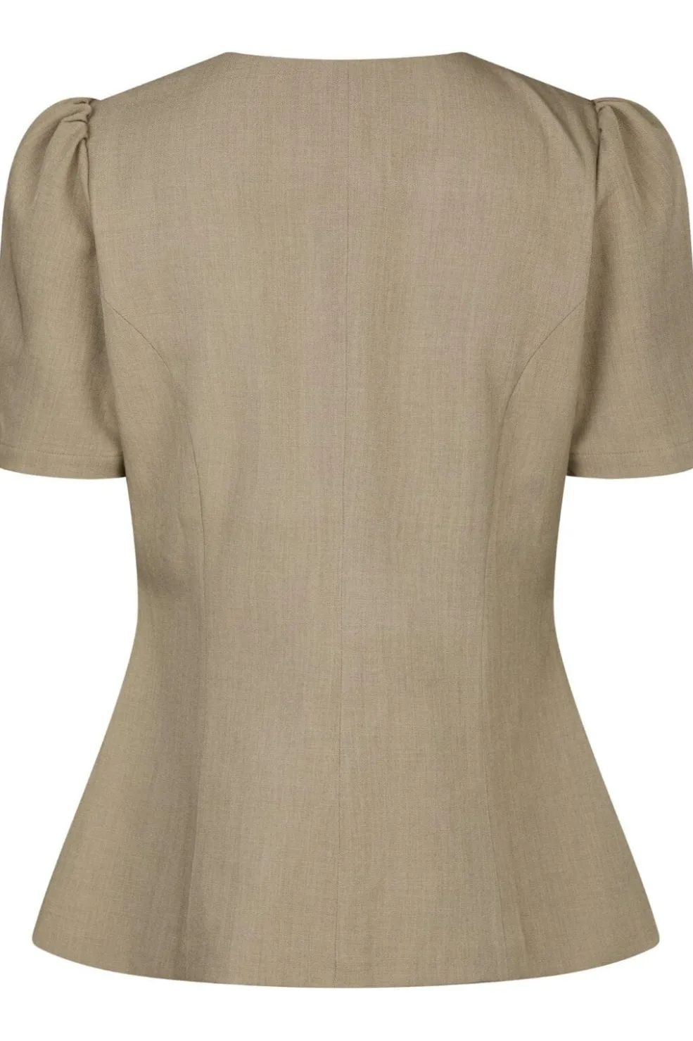 Struktureret bluse fra Neo Noir i mørk taupe. Blusen har en skræddersyet pasform med let flare ved taljen, V-hals og knapper hele vejen ned foran.