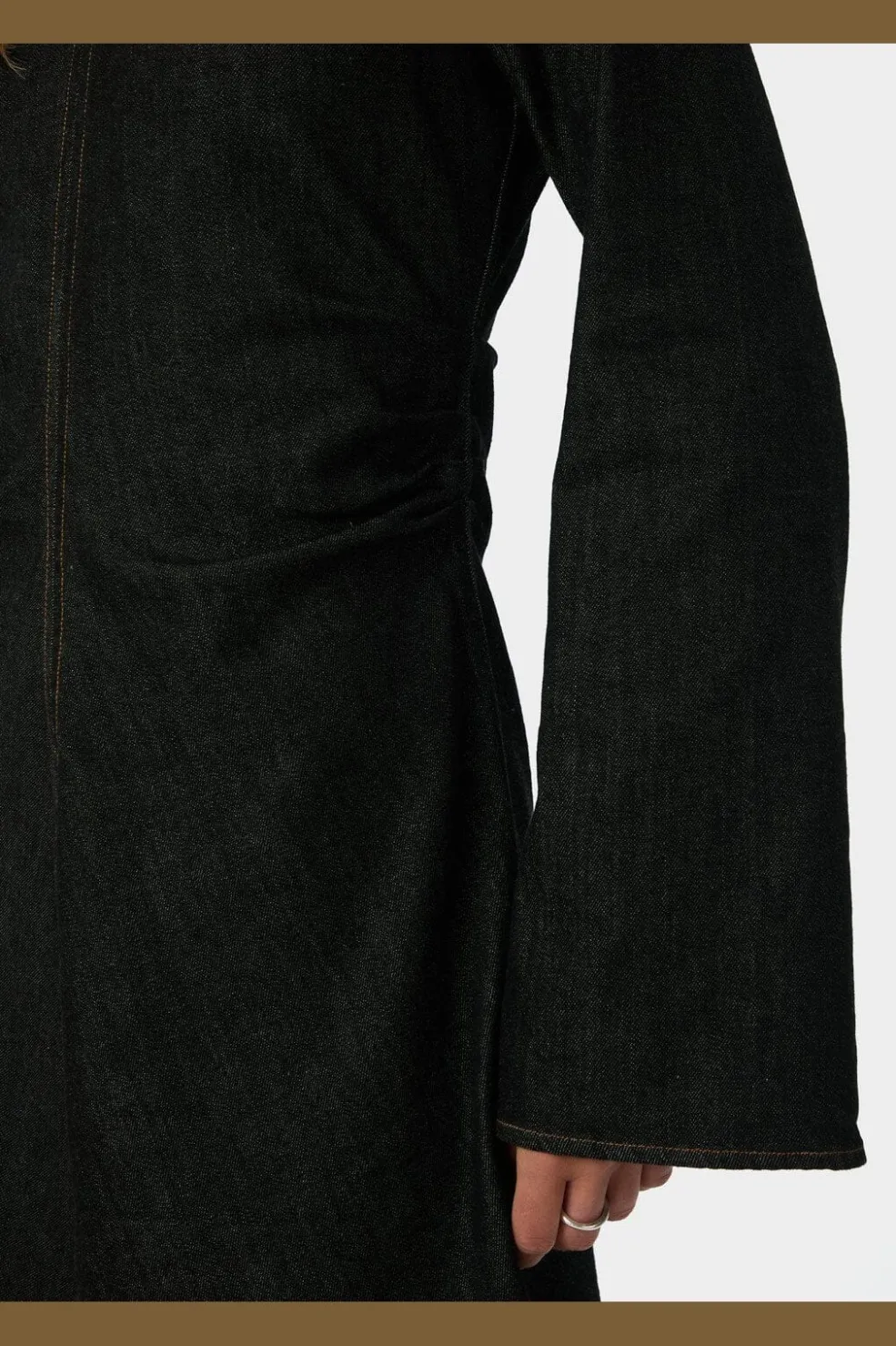 Sort denimkjole fra Neo Noir med en tætsiddende pasform og lange ærmer med vidde. Kjolen har rund hals og lynlås i ryggen.