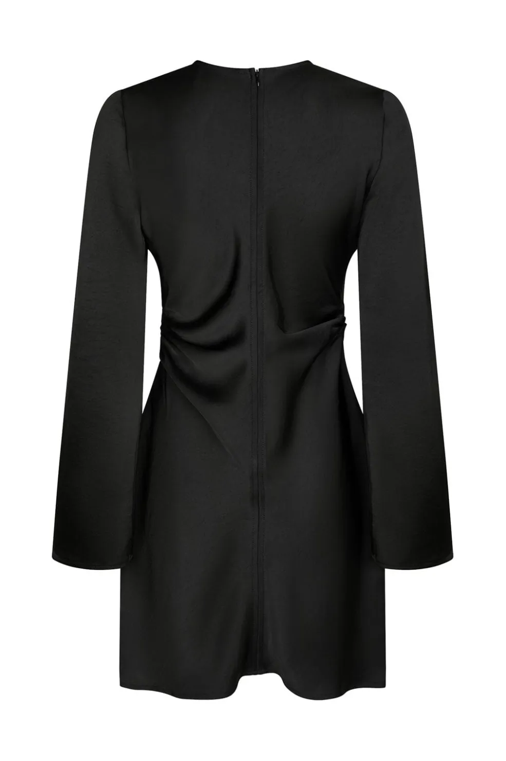 Sort satinkjole med tætsiddende silhuet og lange ærmer. Kjolen har flæsedetaljer og vidde i ærmerne. En lynlås på bagsiden gør den nem at tage på og af.