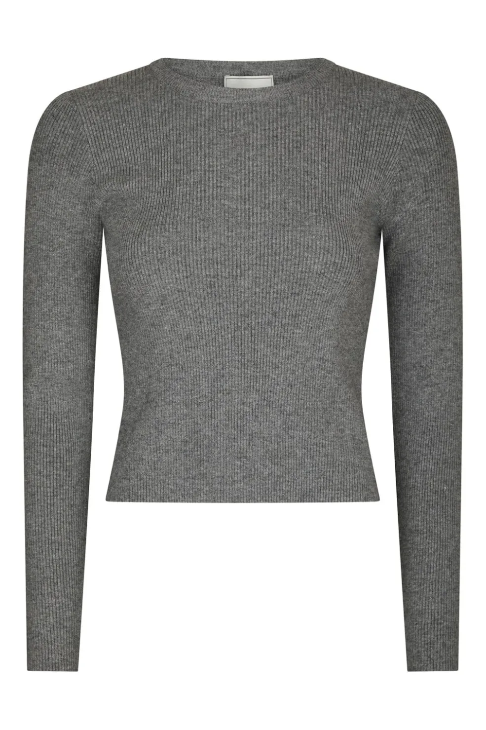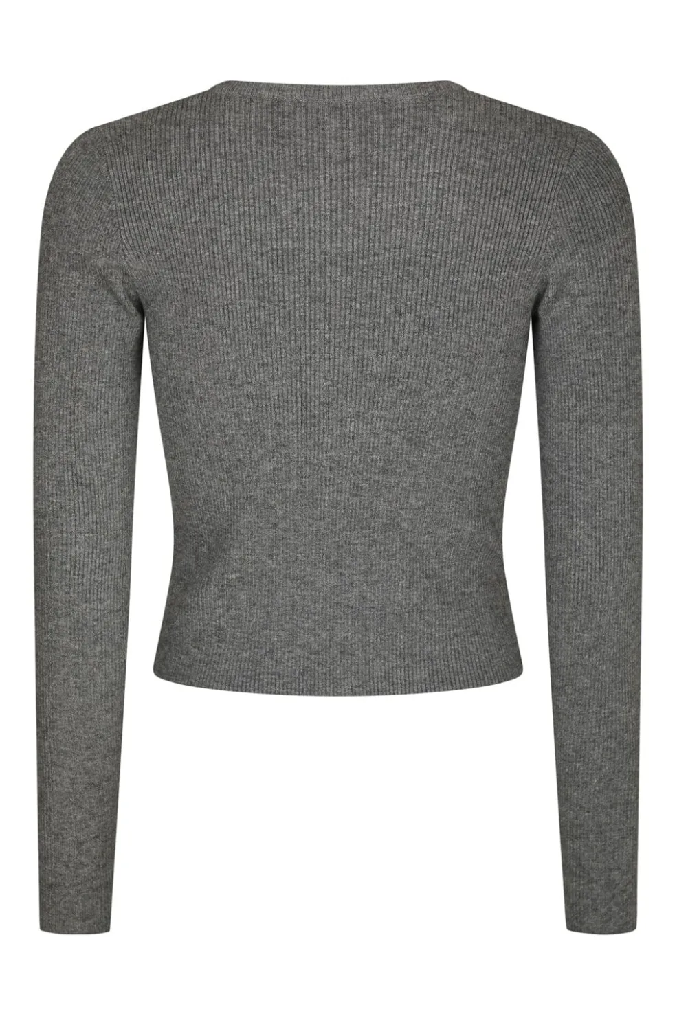 Mørkegrå meleret strikbluse fra Neo Noir med ribbet struktur. Blusen har en tætsiddende pasform og lange ærmer, der giver en kropsnær silhuet.