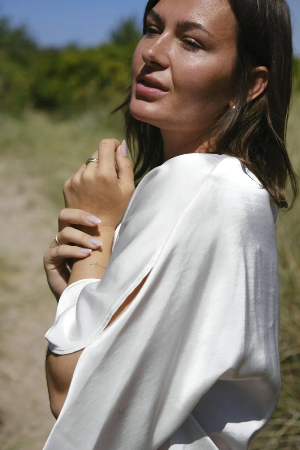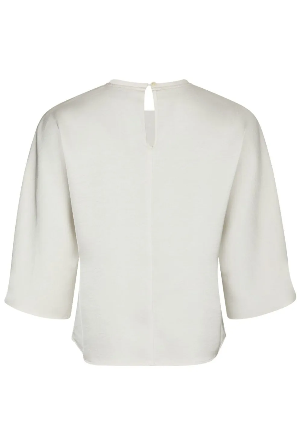 Satinbluse fra Neo Noir i en lys perlefarve. Blusen har brede ærmer med slidser og en rund halsudskæring med nøglehuldetalje i nakken.