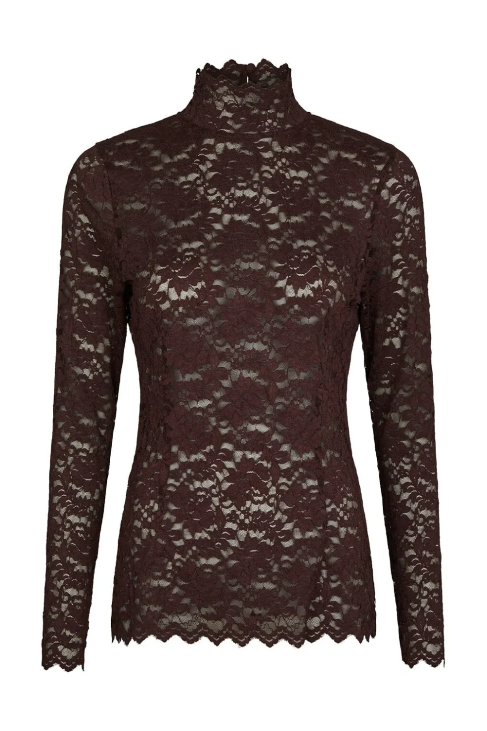 Bordeauxfarvet blondebluse fra Neo Noir med høj hals og bølget kant. Blusen har en figursyet pasform og er lavet af strækbart blondemateriale med blomstermønster.