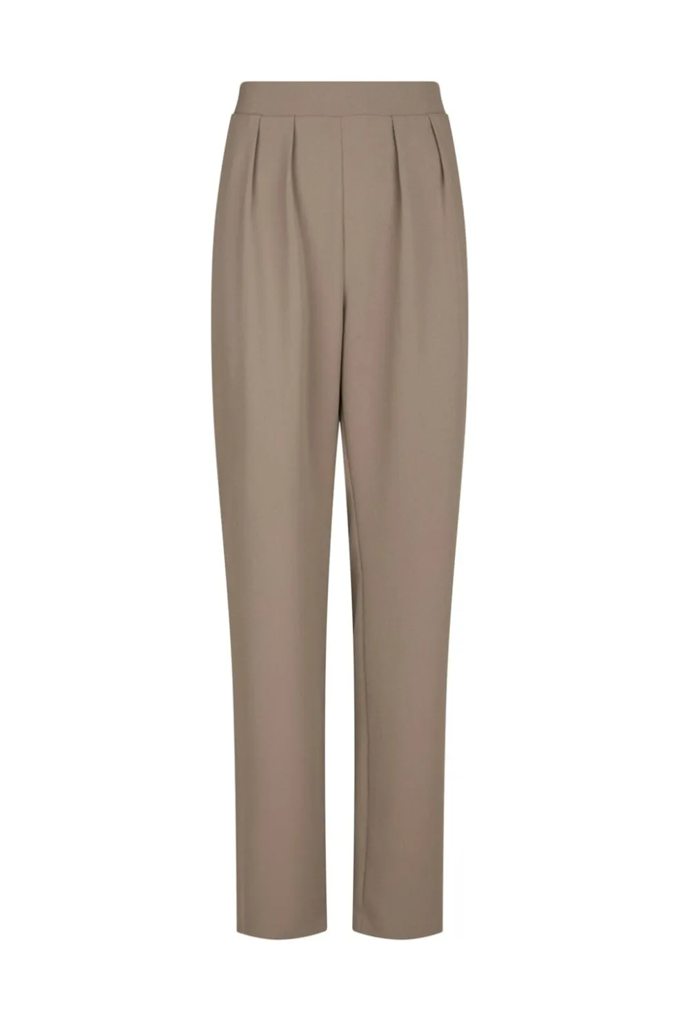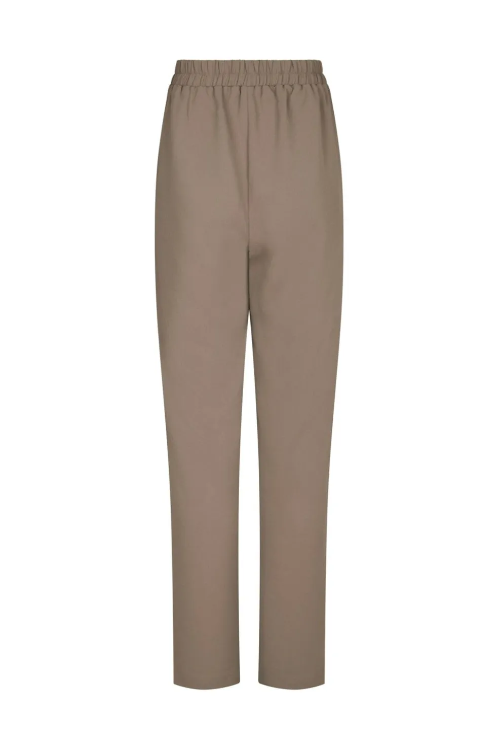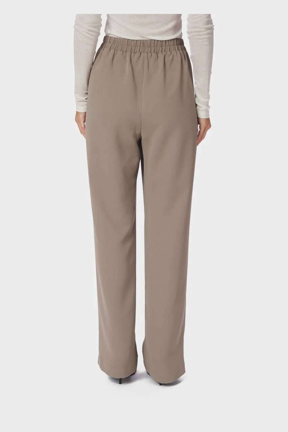 Bukser fra Neo Noir i taupe. De løse bukser har brede ben og ankellængde. De er lavet i en blød crepe-kvalitet med elastik i taljen og frontlægs, der giver et skræddersyet udtryk.