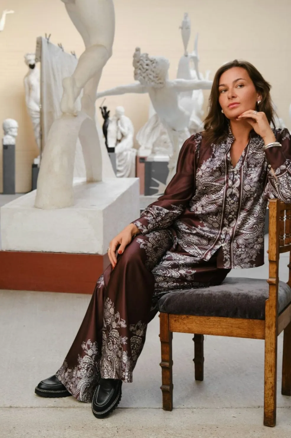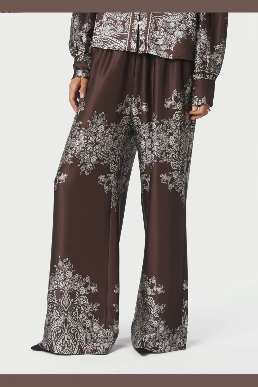 Mørkebrun bukser fra Neo Noir i satin med paisley-mønster. Bukserne har vide ben og går til gulvet, med elastik i taljen for nem af- og påtagning.