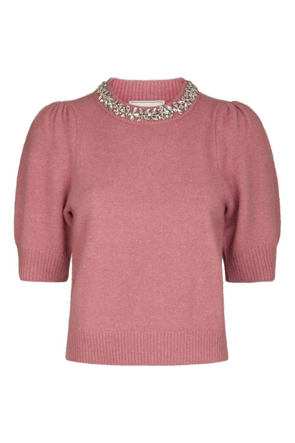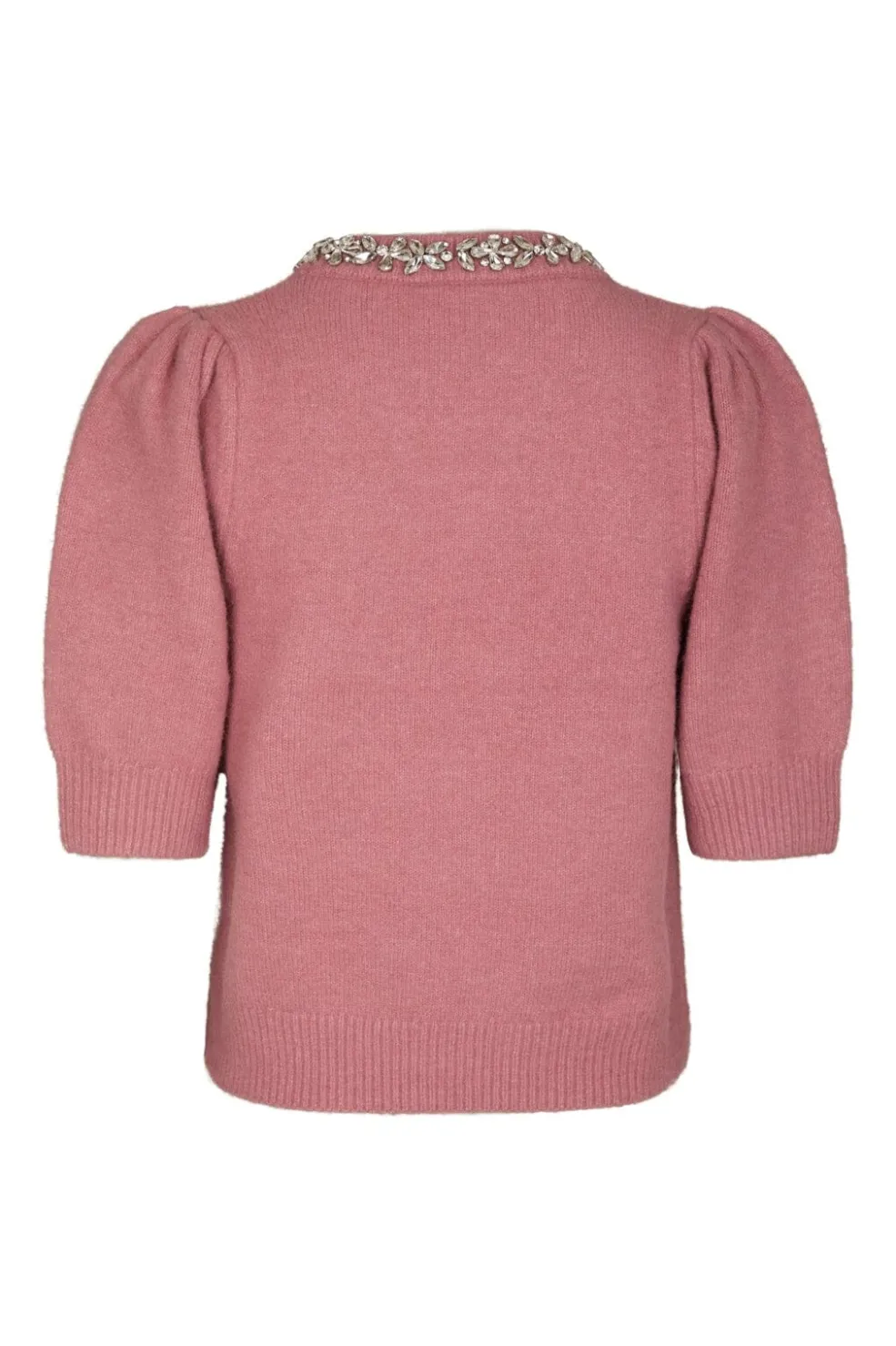 Lyserød strikbluse fra Neo Noir med puffede ærmer og rund hals. Blusen har glitrende dekorationer ved kraven og en kort ærmelængde.