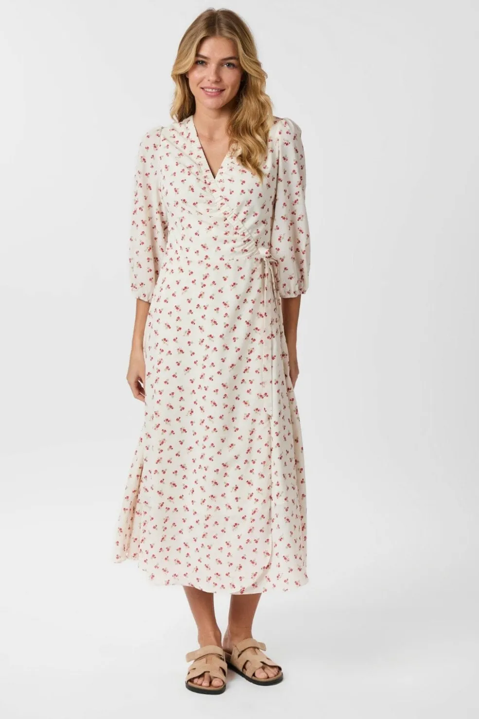 Hvid kjole fra Neo Noir med røde blomster. Kjolen har V-hals og 3/4 ærmer. Bindebåndet i taljen giver mulighed for at tilpasse pasformen.
