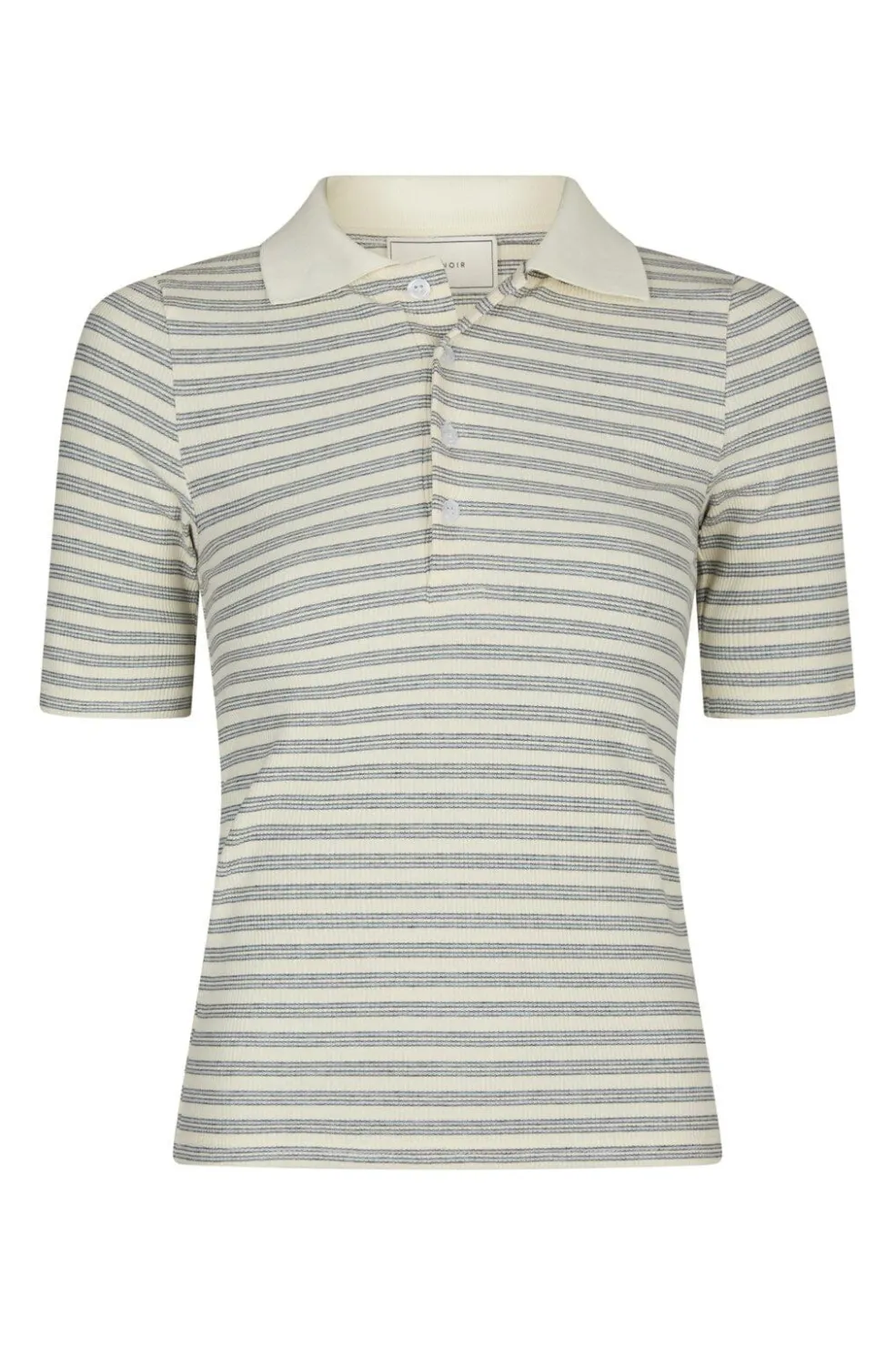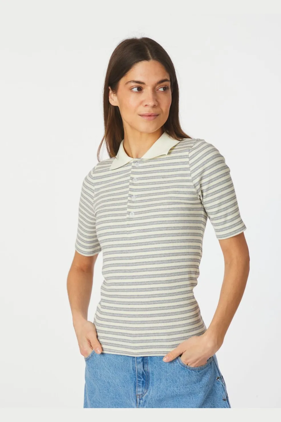 Stribet polobluse fra Neo Noir i lyseblå og cremefarvede striber. Blusen har en slim fit-pasform og er lavet af blødt bomuldsstof med stretch.