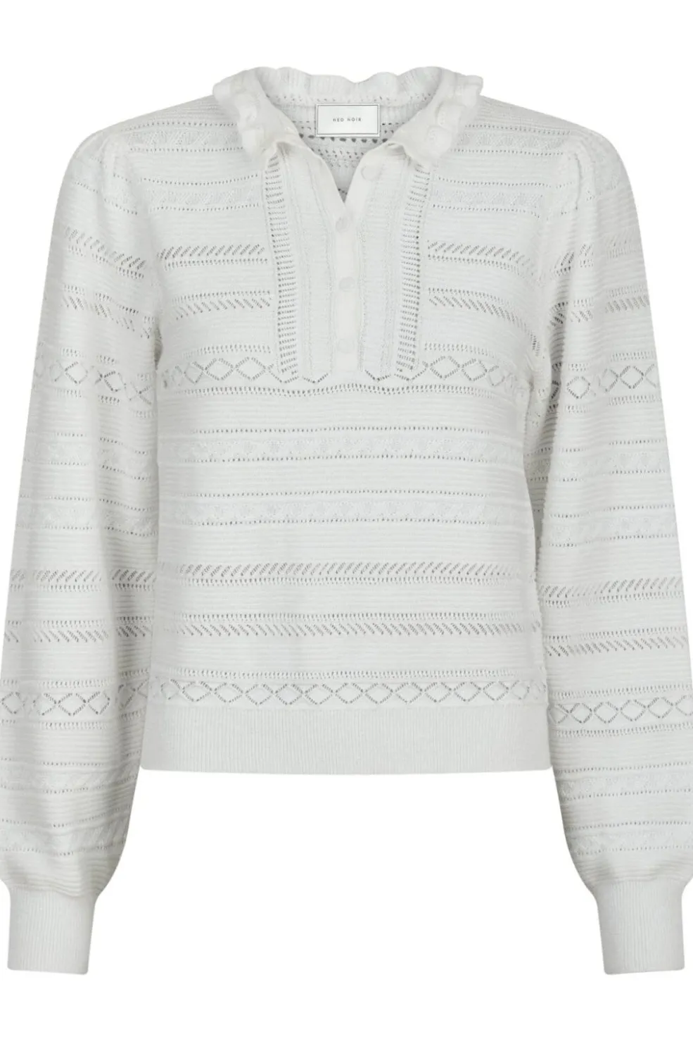 Hvid strikbluse fra Neo Noir med mønster. Blusen har et strikket design med vandrette og diamantformede mønstre samt flæsedetaljer ved polokraven.