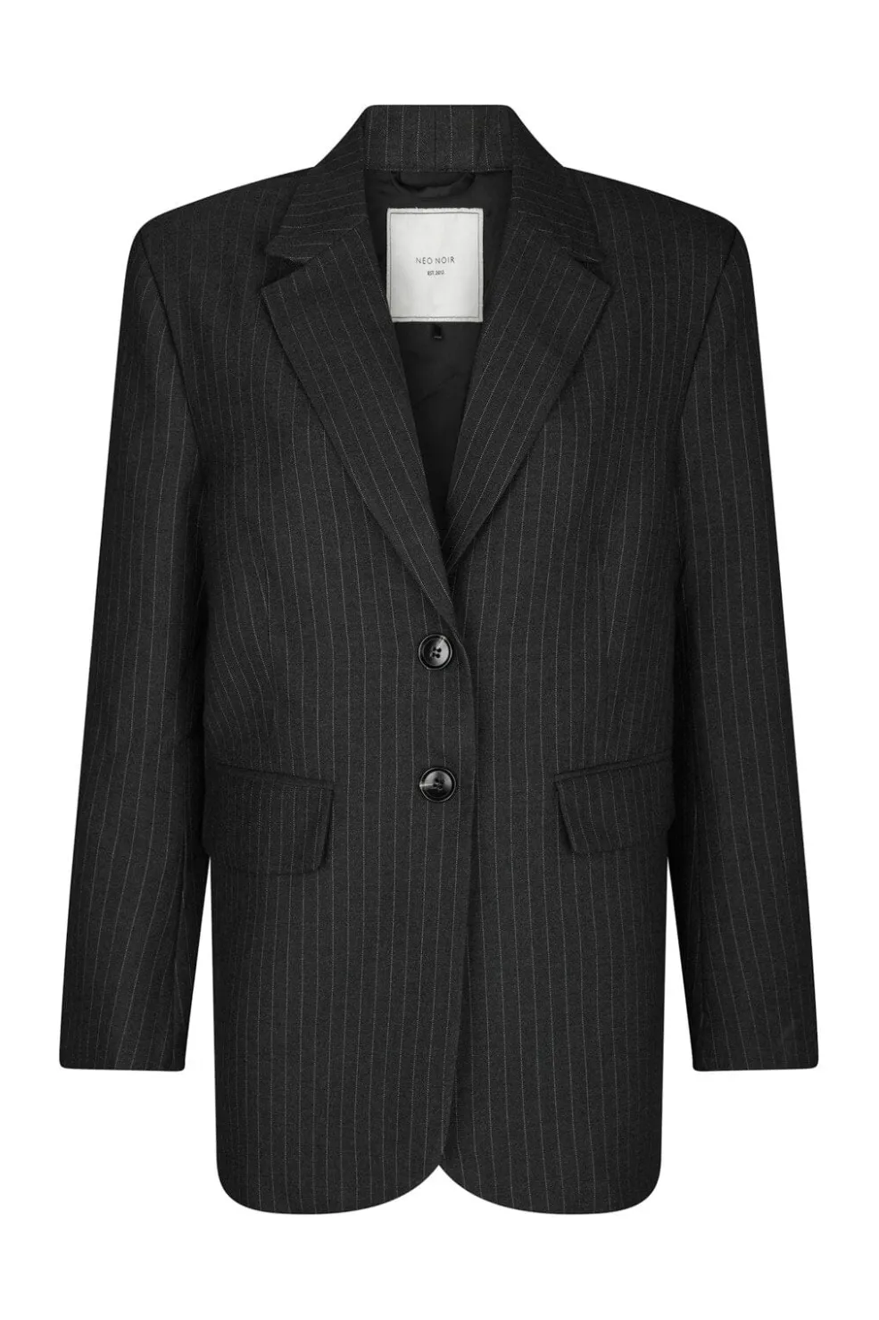 Antracitfarvet blazer fra Neo Noir med nålestribet mønster. Den har en oversized pasform og knapper både foran og på ryggen. V-udskæring og lange ærmer giver blazeren et klassisk snit.
