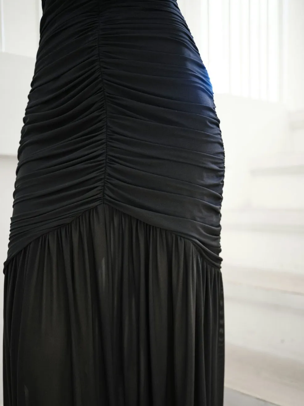 Sort meshkjole fra Neo Noir med rynkedetaljer langs siderne og under brystpartiet. Kjolen har en tætsiddende pasform og lang længde med en flydende nederdel.
